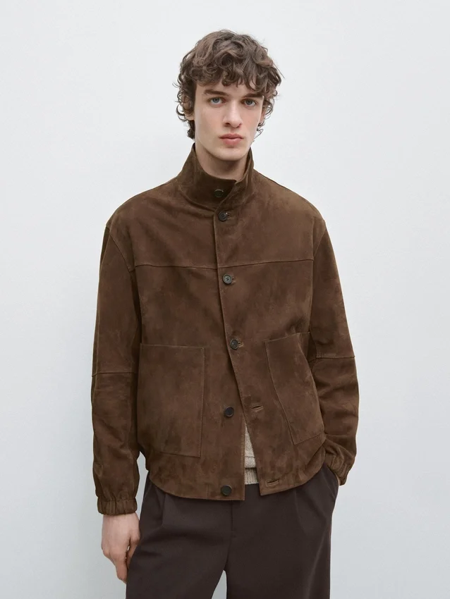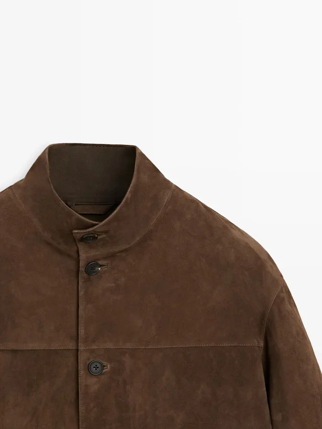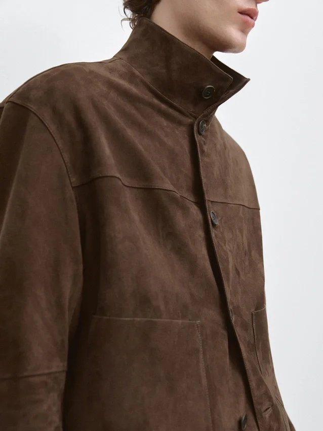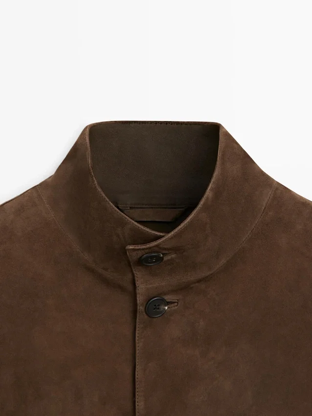 Jacket Made of Goatskin Leather with a Suede Finish. Long Sleeves. Button Fastening. Buttoned-Up High Neck. Two Patch Pockets.