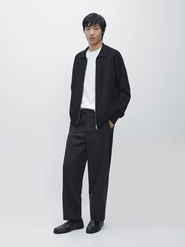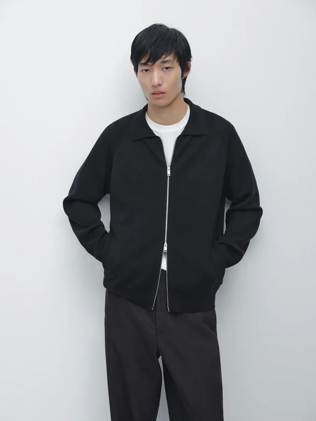 Cotton Blend Knit Cardigan. Long Sleeves. Zip Fastening. Polo Collar.