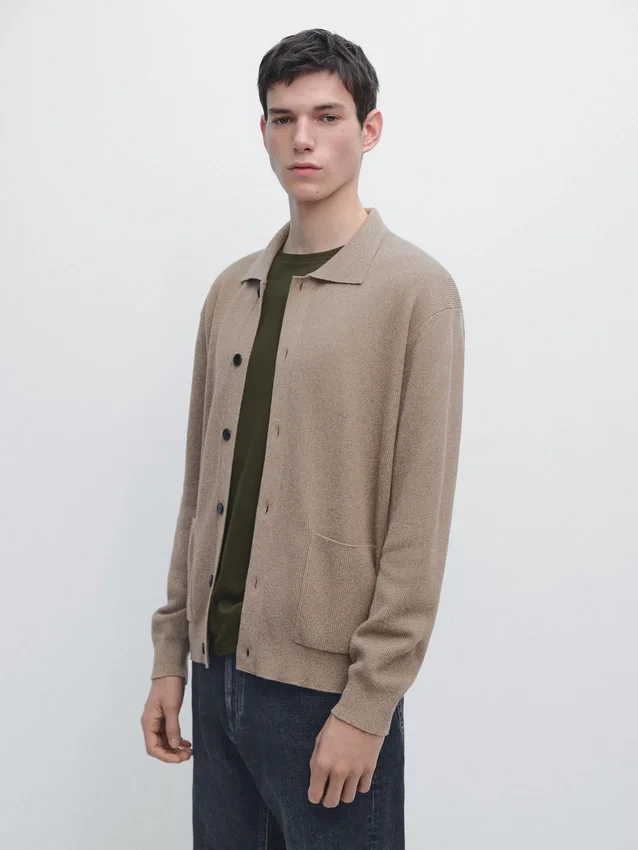 Cardigan Made of Knitted Fabric with Cotton. Button-Up Front. Polo Collar. Patch Pockets.
