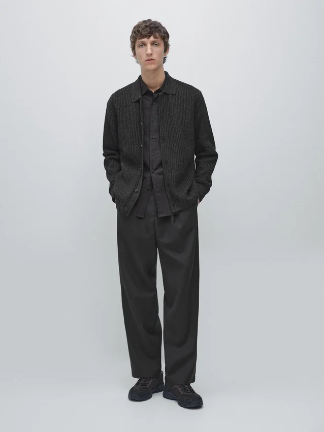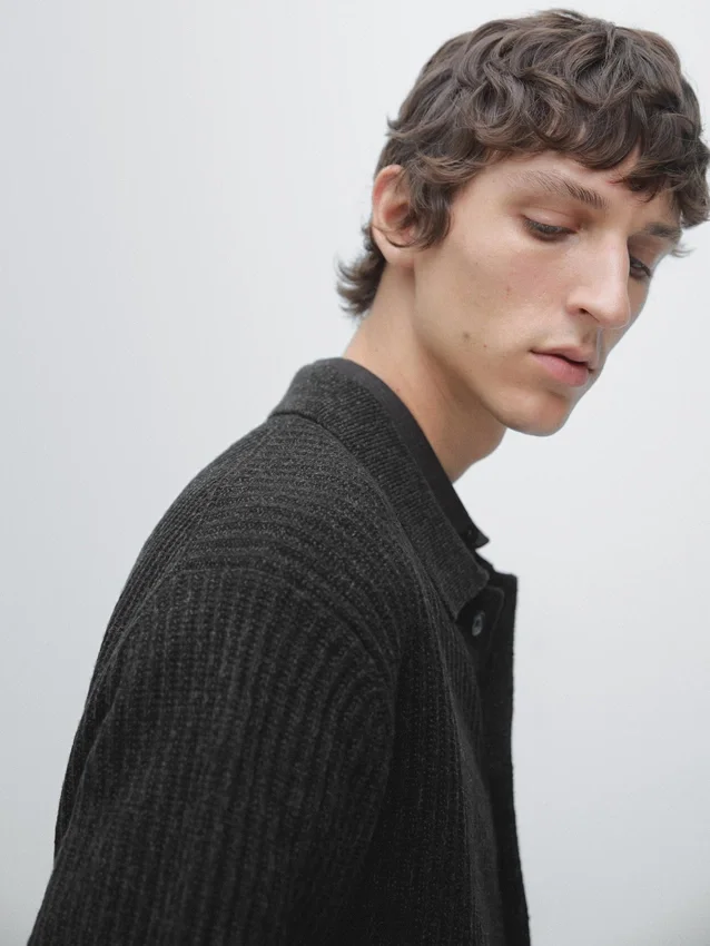 Cardigan Made from Knitted Fabric with Cotton and Wool. Long Sleeves. Button-Up Front. Polo Collar. Ribbed Trims . Ribbed Fabric.