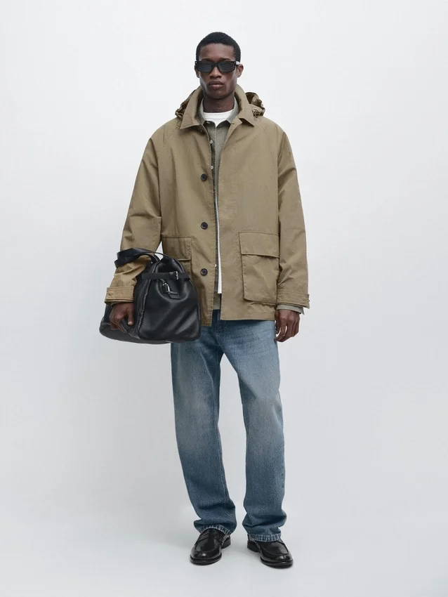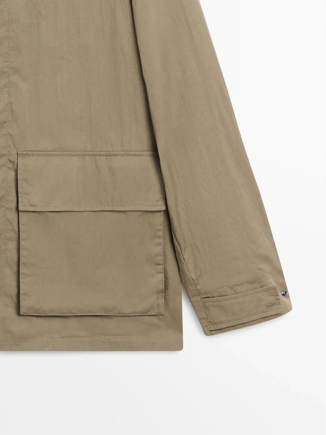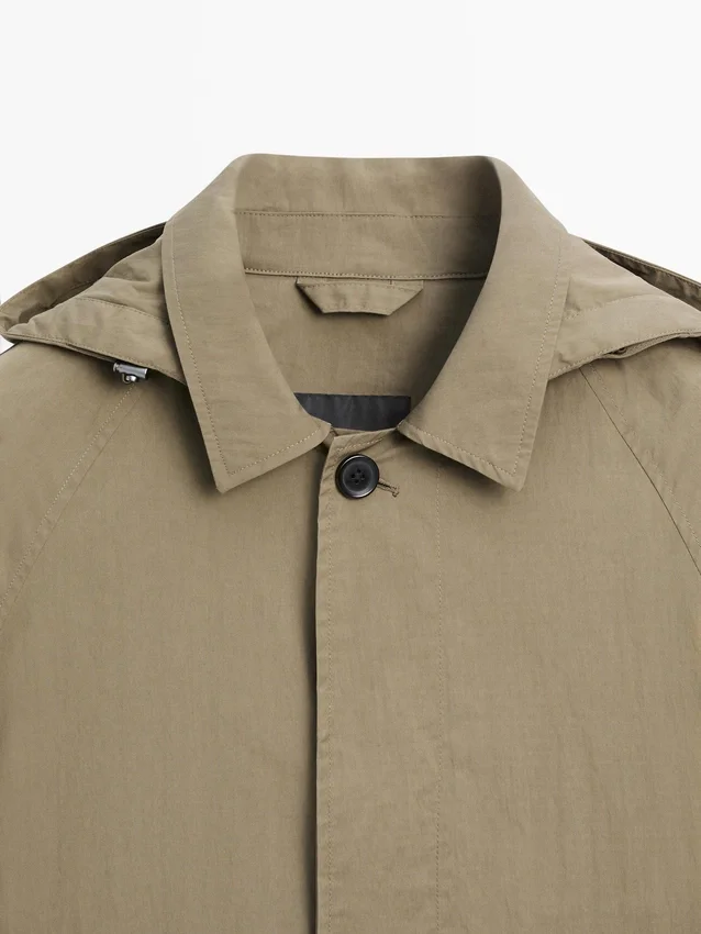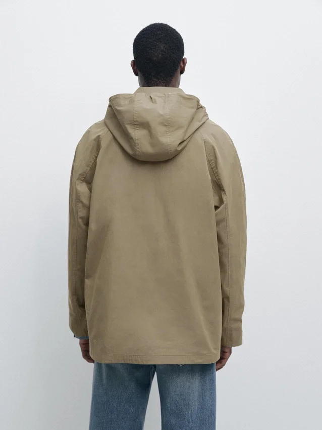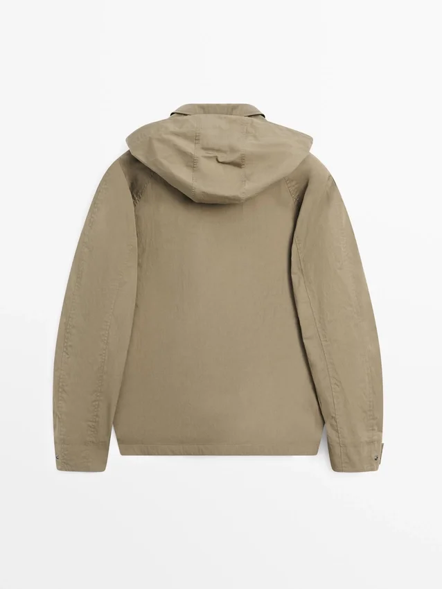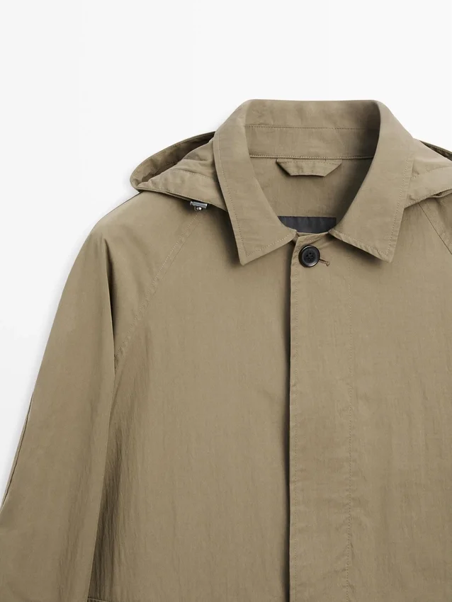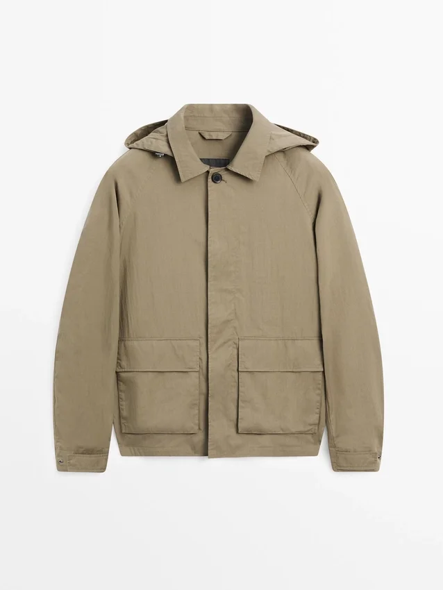 Parka Made of Cotton Blend Fabric. Long Sleeves with Buttoned Cuffs. Shirt Collar. Detachable Hood Detail. Button-Up Front. Two Patch Pockets with Flaps.