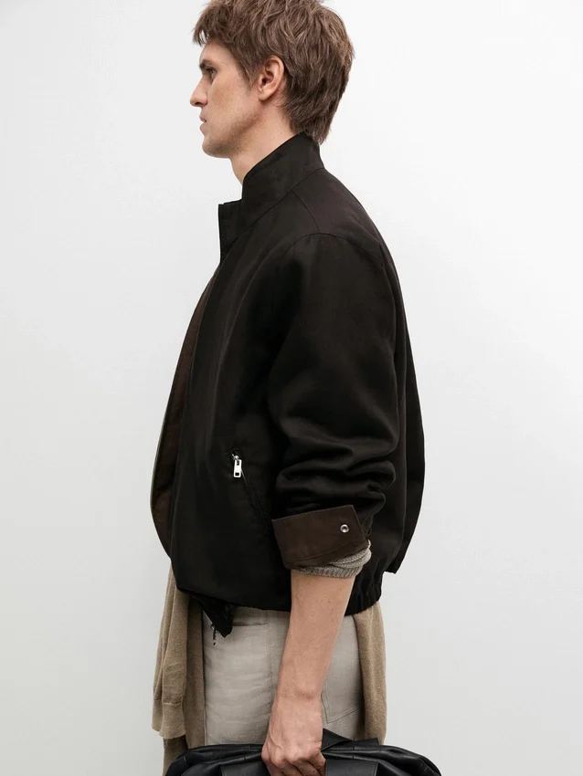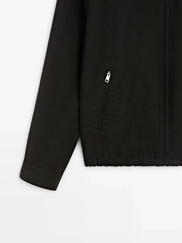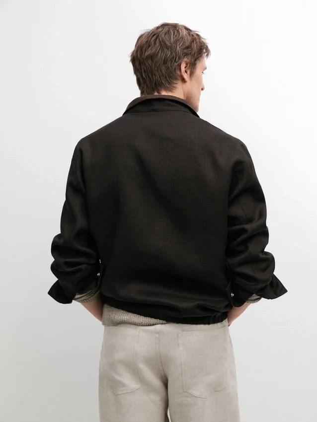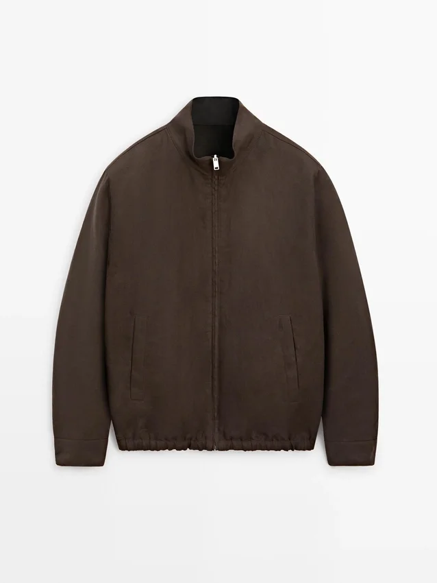 Jacket Made of 100% Linen Fabric. High Neck. Long Sleeves. Zip Fastening. Two Zipped Pockets. Elastic Band Detail at the Hem Area. Reversible Garment.
