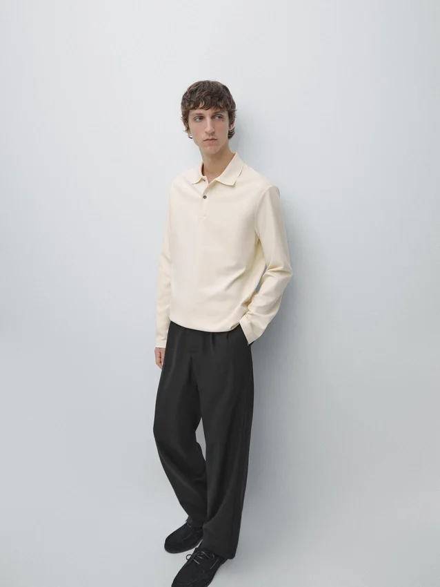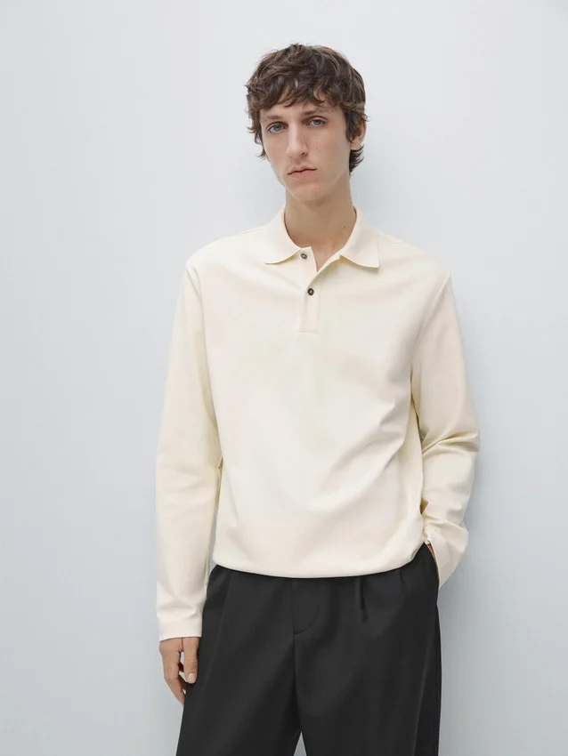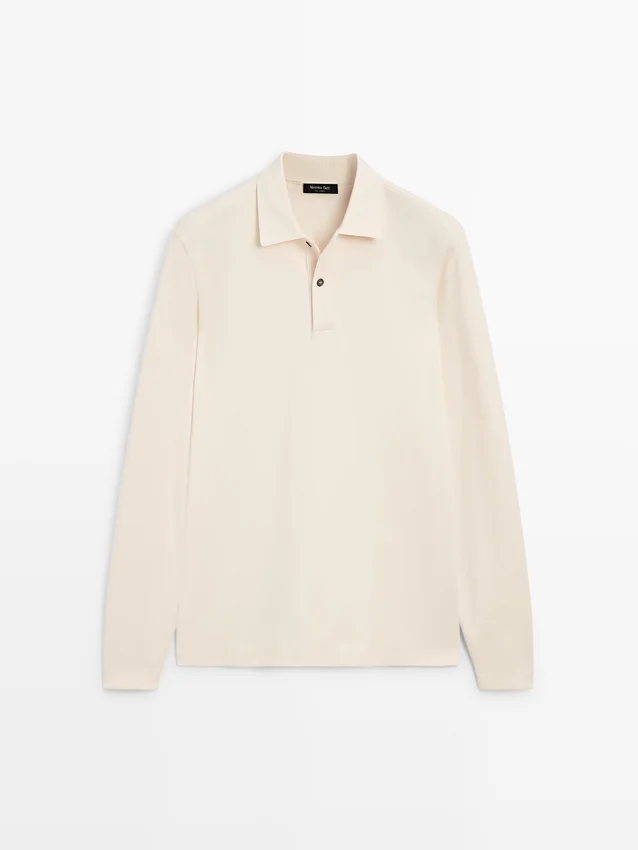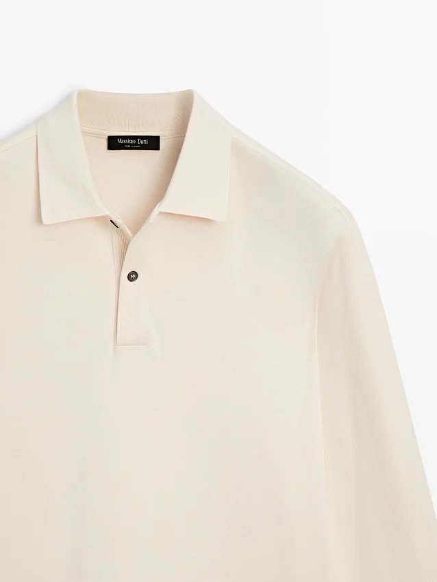 T-Shirt Made of Cotton. Long Sleeves. Polo Collar with Button Fastening. Rib Detail on the Collar.