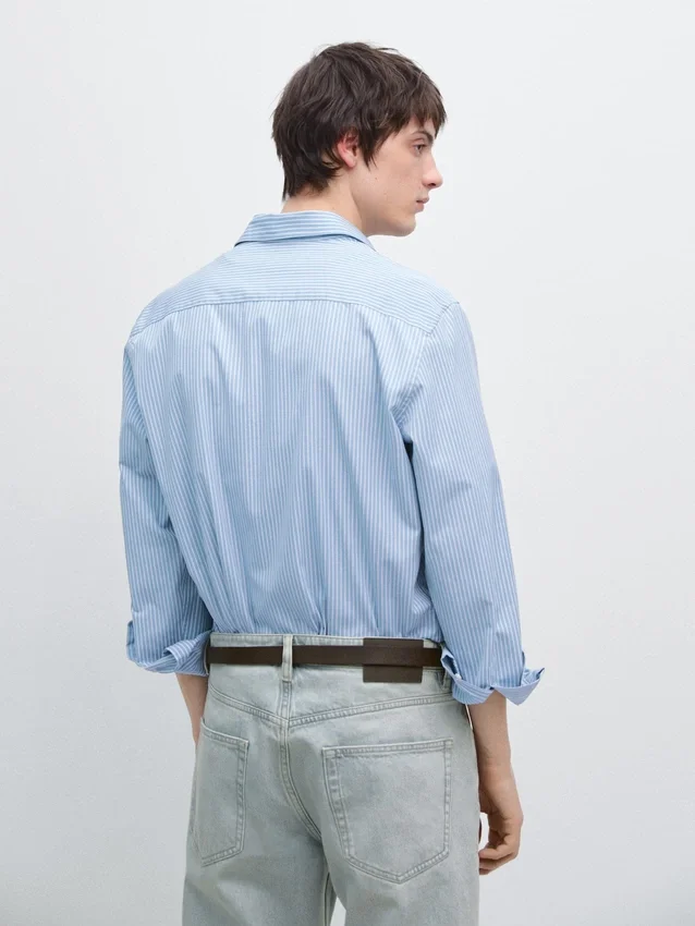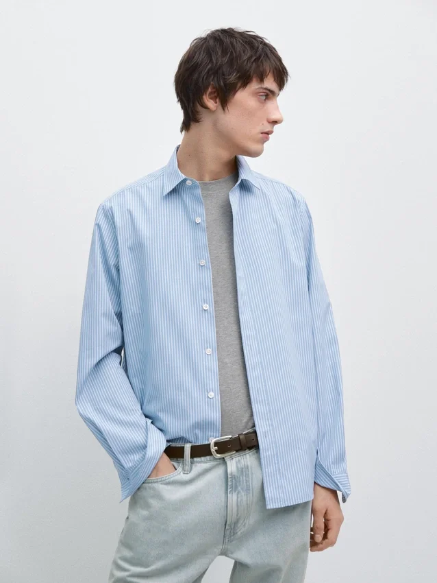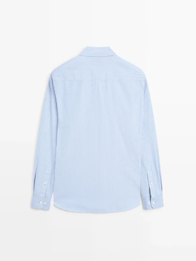 Shirt Made of a Cotton Blend Fabric. Long Sleeves with Buttoned Cuffs. Shirt Collar. Button-Up Front. Double Stripe Detail.