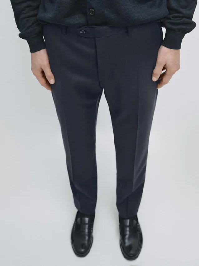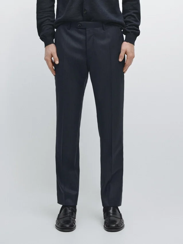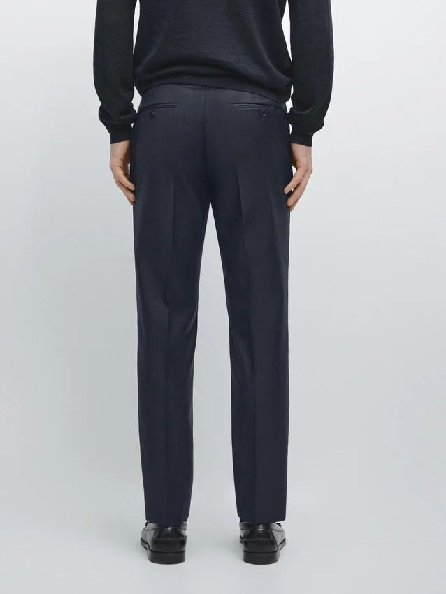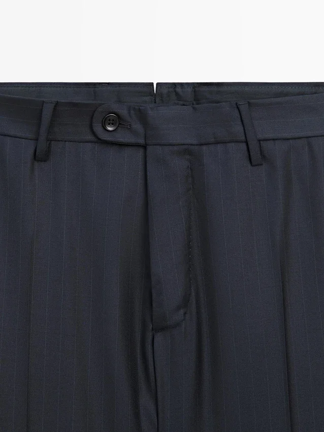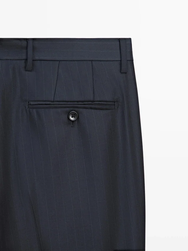 Suit Trousers Made from 100% Wool Main Fabric. Zip Fastening Concealed by a Placket, Button and Buttoned Strap. Two Side Pockets. Two Buttoned Welt Pockets on the Back. Striped Detail. Cool Wool: Lightweight, Breathable and Wrinkle-Resistant Fabric.. This Garment is Part of a Suit.