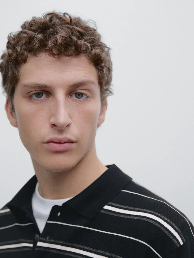 Long Sleeves. Polo Collar with Button Fastening. Striped Print.