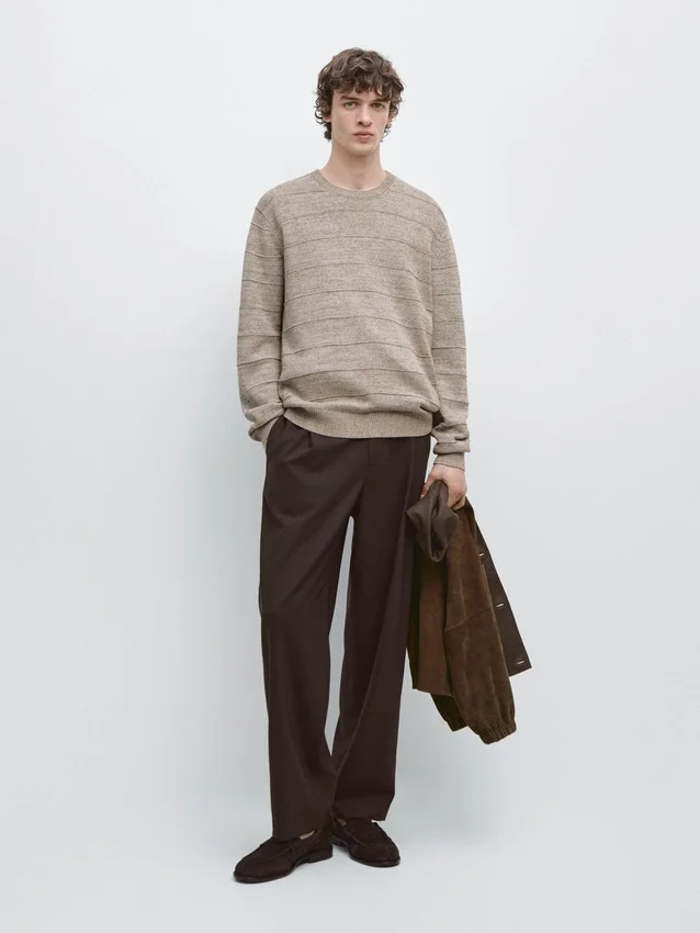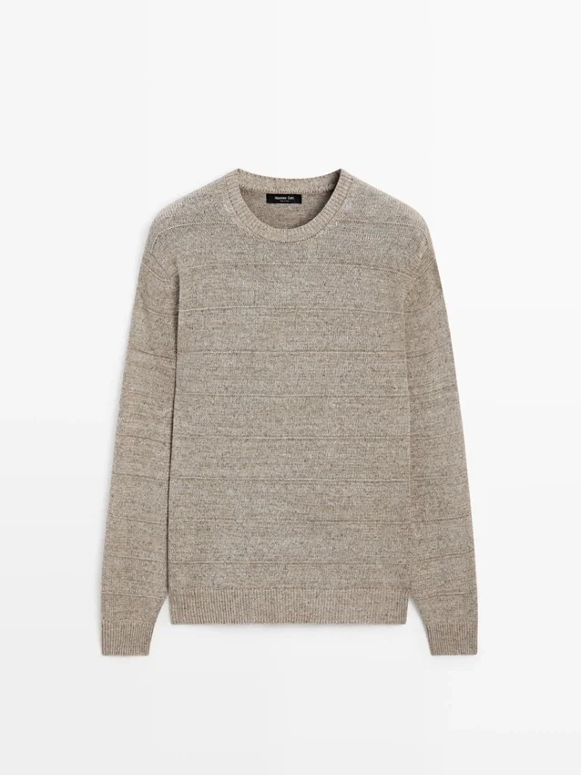 Cotton Blend Knit Sweater. Crew Neck. Long Sleeves. Ribbed Trims . Striped Detail.