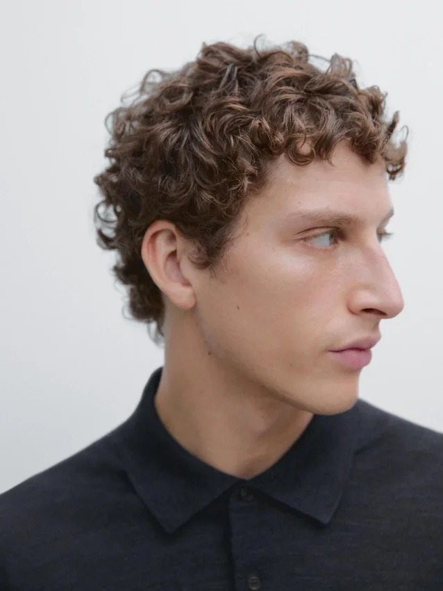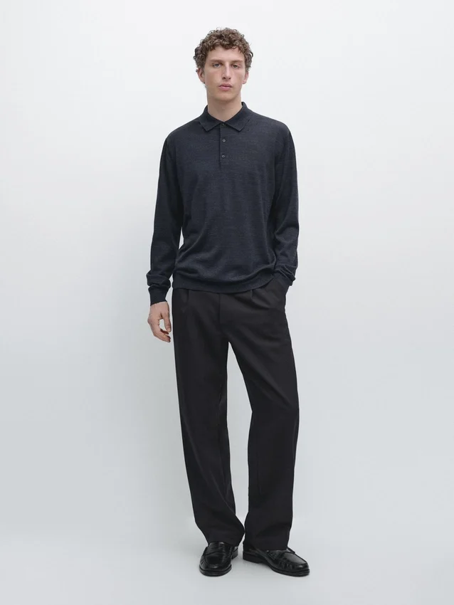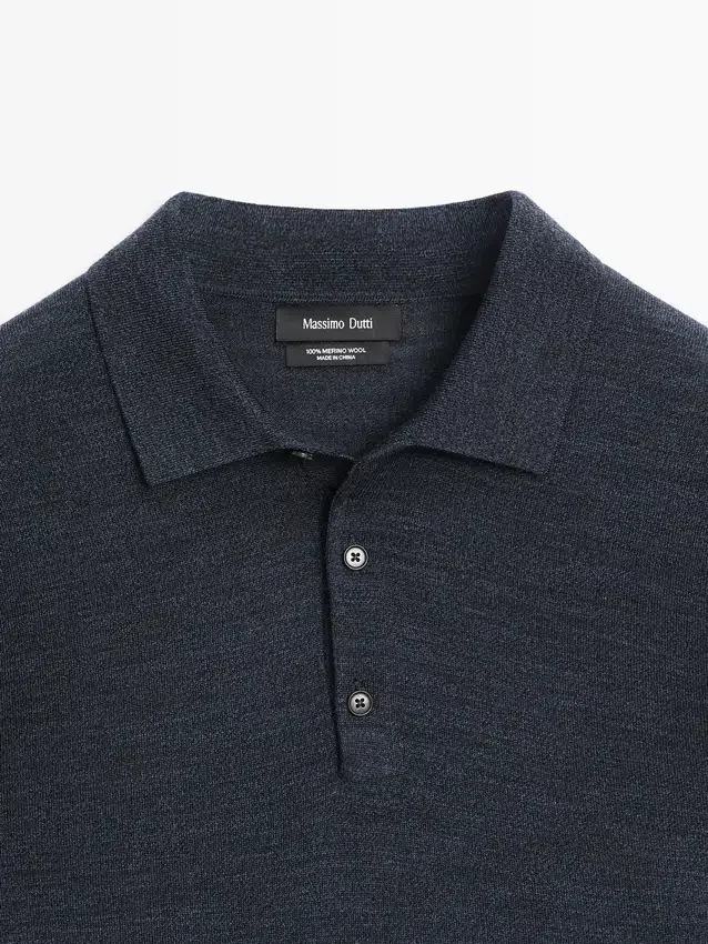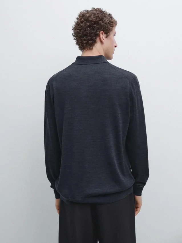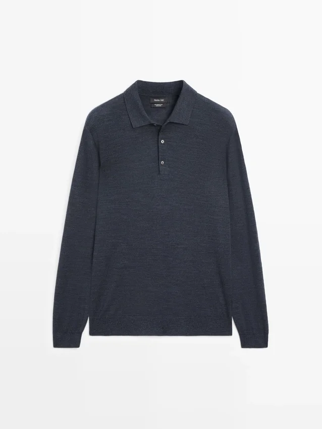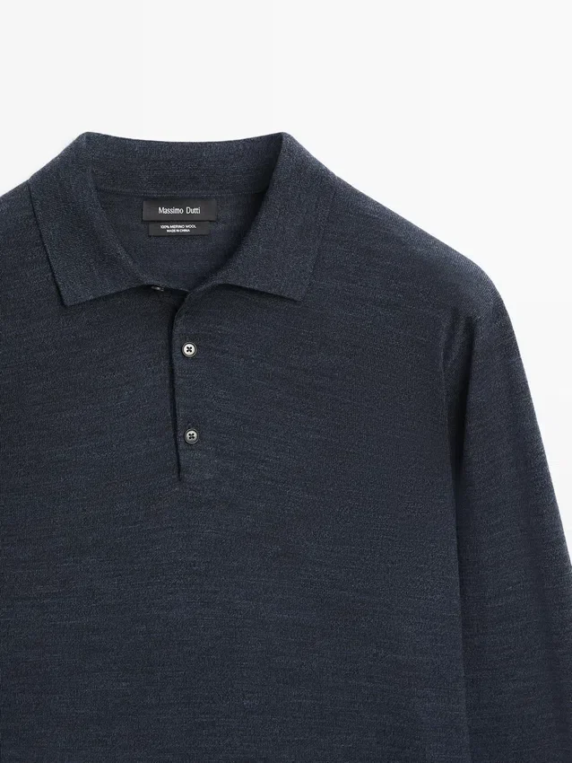 Wool Knit Sweater. Long Sleeves. Polo Collar with Button Fastening. Ribbed Trims .