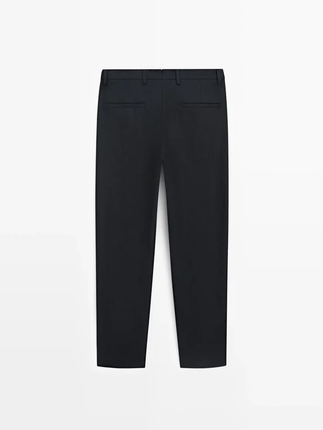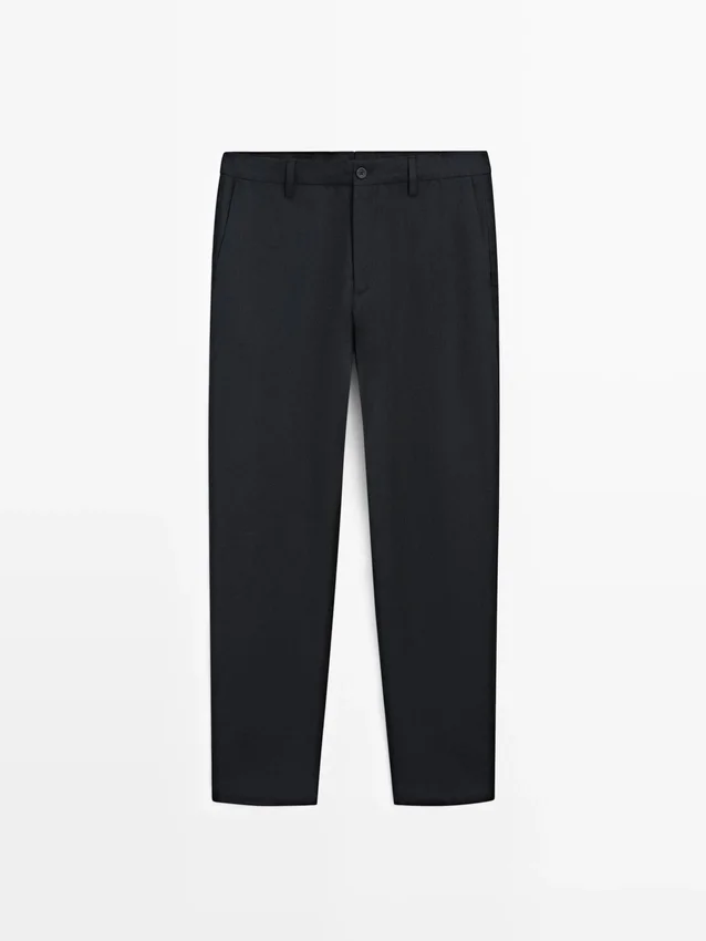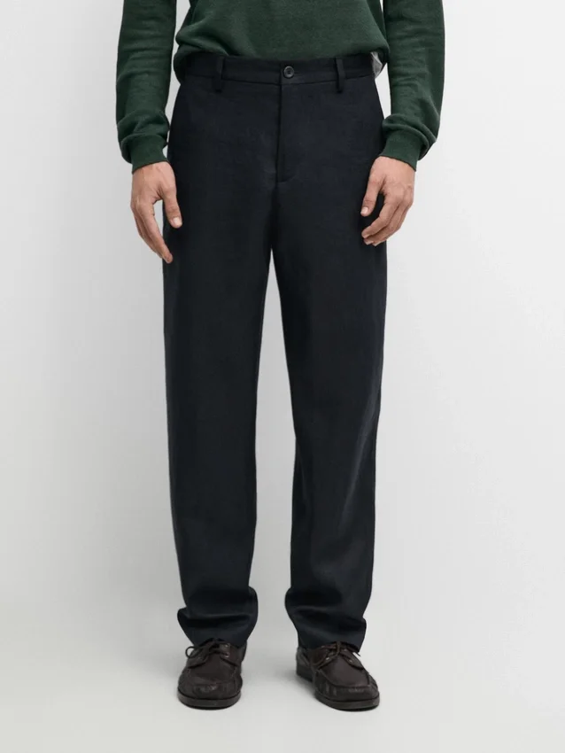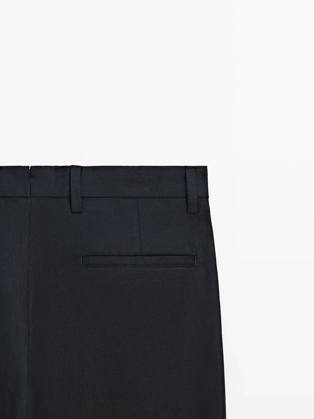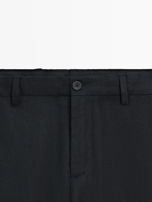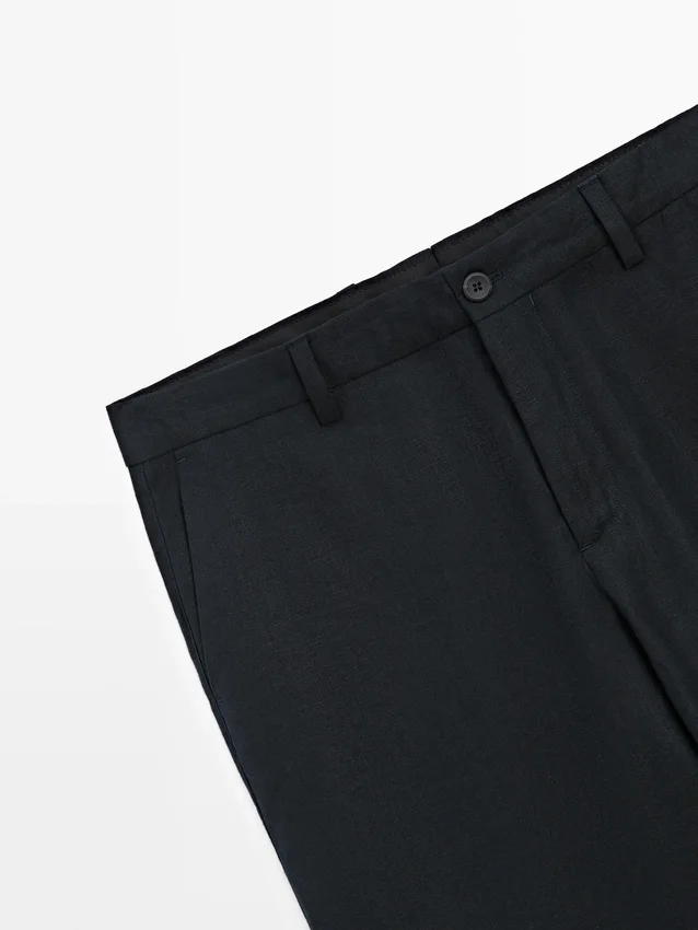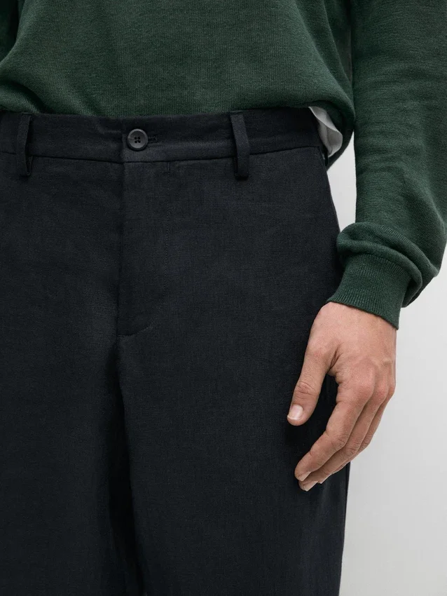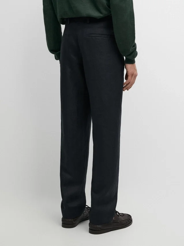 Suit Trousers Made from Linen Main Fabric. Zip Fastening Concealed by a Placket, Button and Buttoned Strap. Two Side Pockets. This Garment is Part of a Suit.