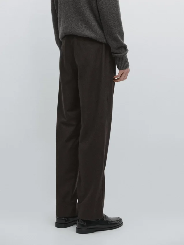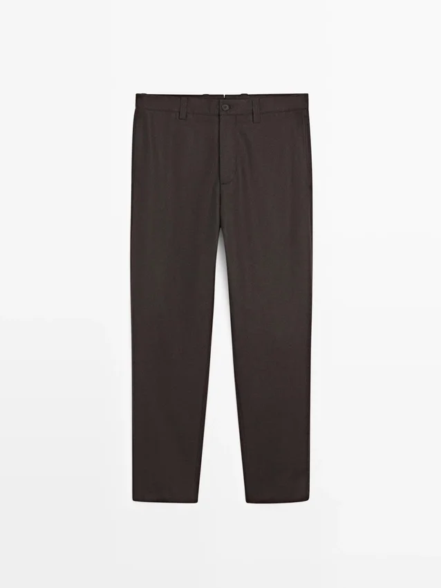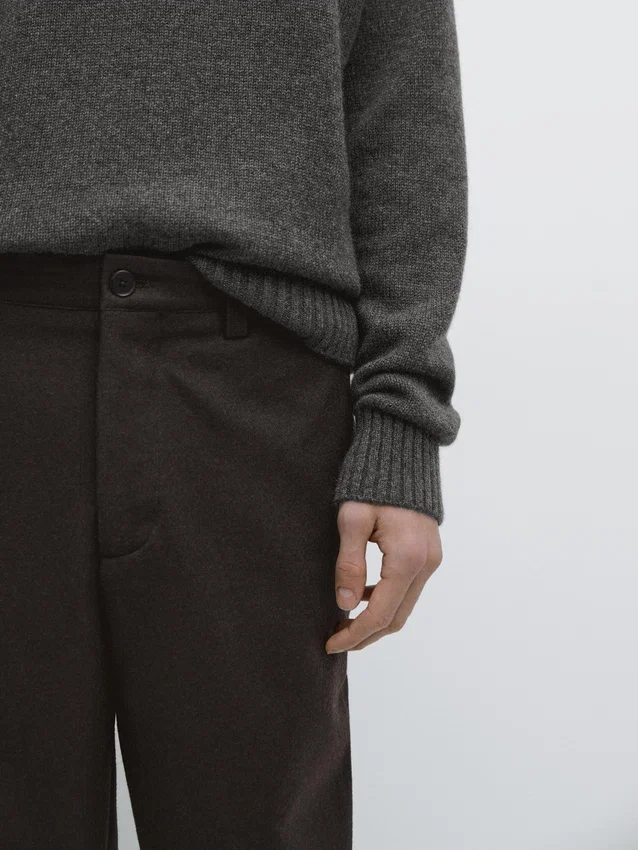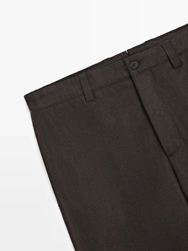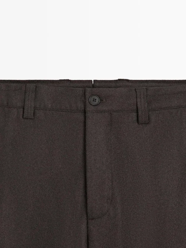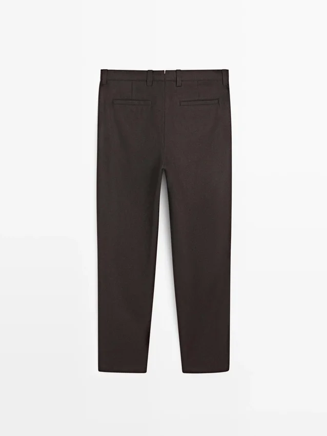 Trousers Made of Wool Blend Fabric. Waistband with Belt Loops . Concealed Zip Fastening with Flap, Button and Inside Button. Two Side Pockets. Two Welt Pockets on the Back. Matching Garment Available.