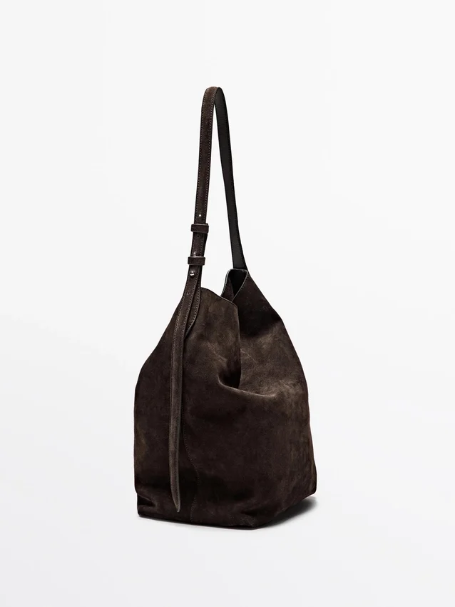 Bucket Bag. Handbag Made of Cowhide with a Split Leather Finish. Adjustable Crossbody Strap. Flap with Concealed Magnetic Clasp Fastening. An Inside Pocket. Main Compartment.
