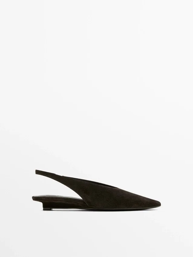 Made of Cowhide Leather with a Suede Finish. Elastic Strap at the Back. Backless. Leather Lining and Insole . Heel: 2 Cm.