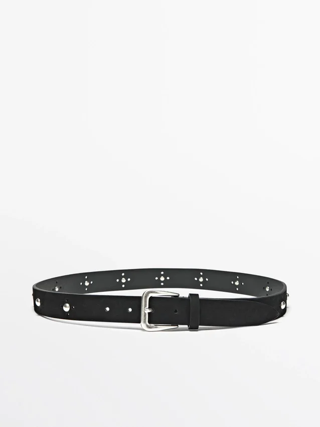 Belt Made of 100% Cowhide Leather. Metal Buckle Fastening and Leather Belt Loop. Stud Detail.