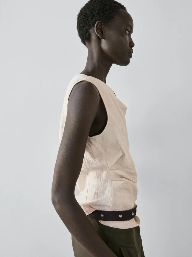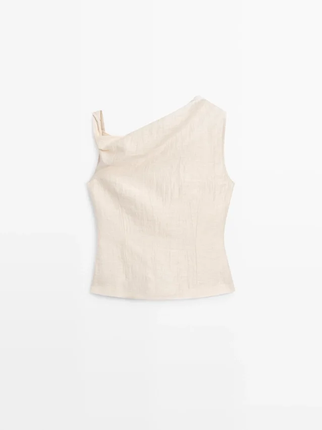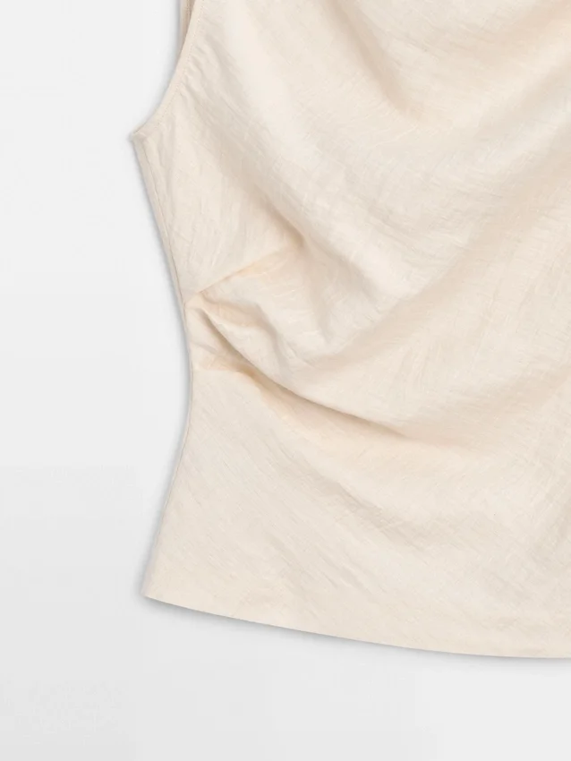 Asymmetric Top with Draped Details. Sleeveless. Knot Detail . Matching Garment Available.