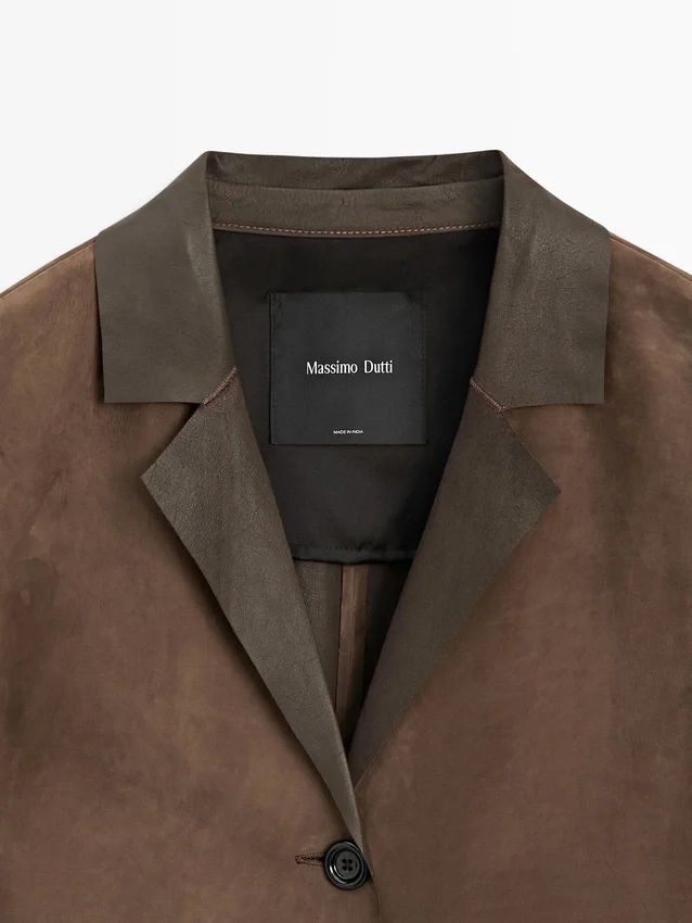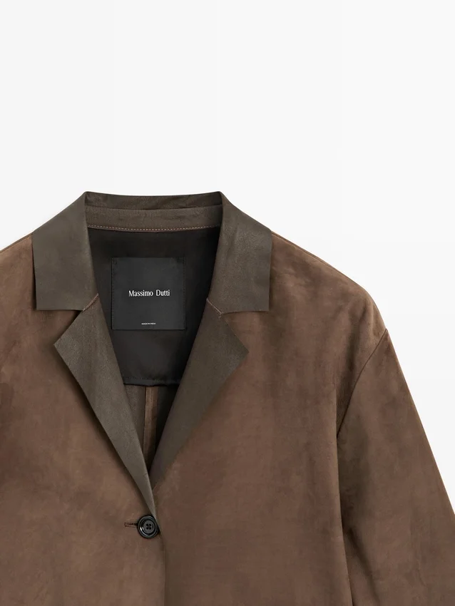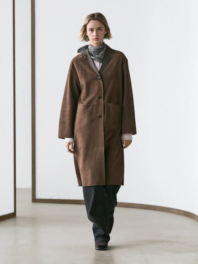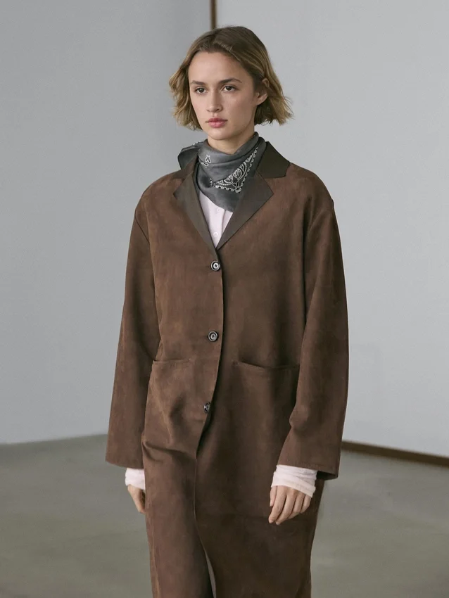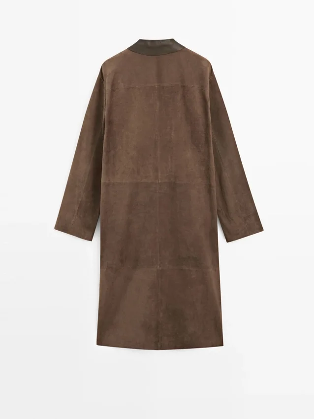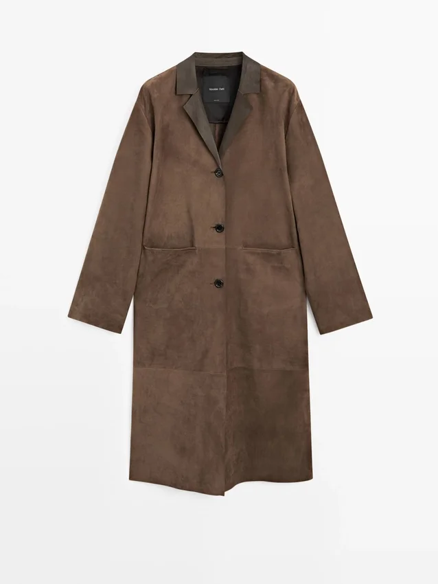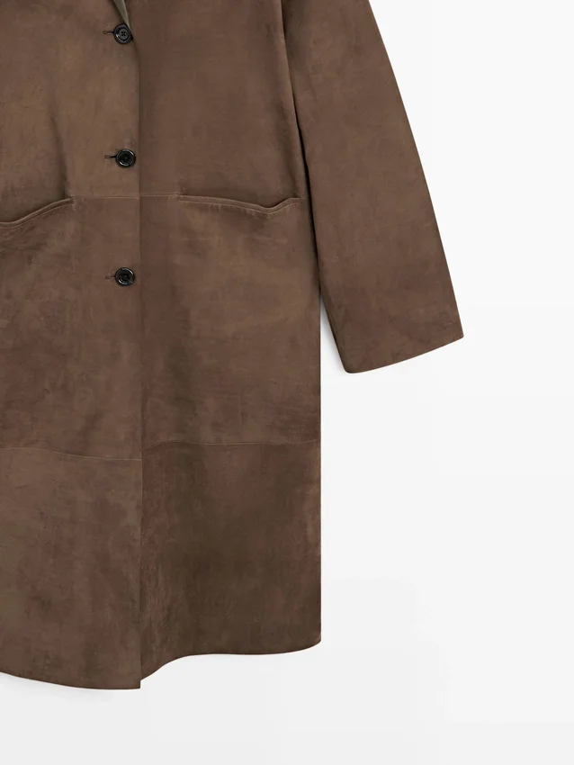 Long Coat Made of Suede Finish Cowhide Leather. Lapel Collar. Three-Button Fastening. Two Jetted Pockets.