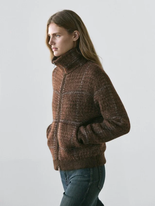 Jacket Made from Knitted Fabric with Alpaca and Wool. High Neck. Long Sleeves. It Has a Two-Way Zip Fastening. Two Front Pockets . Check Print. Brushed Finish.