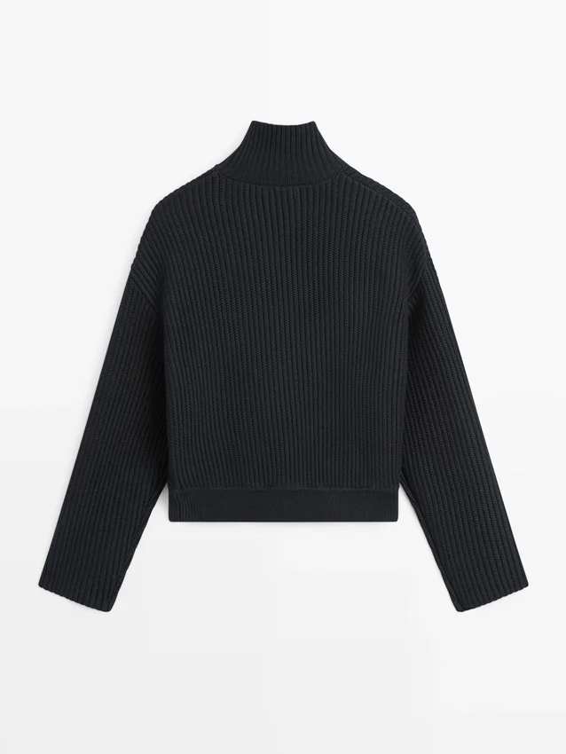 Cardigan Made of Knitted Fabric with Cotton. Buttoned High Collar. Long Sleeves. Button-Up Front. Ribbed Trims .