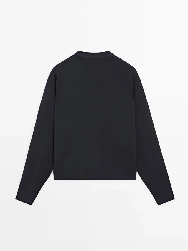 Cardigan Made of Knitted Fabric with Cotton. Crew Neck. Long Sleeves. Button-Up Front. Two Front Pockets . Rib Knitted Collar, Cuffs and Back Bottom Hem .