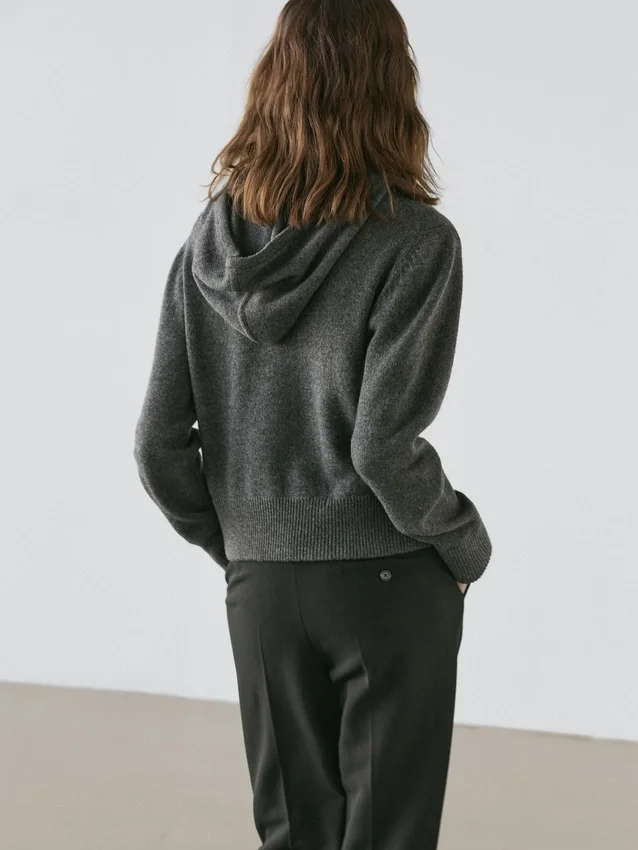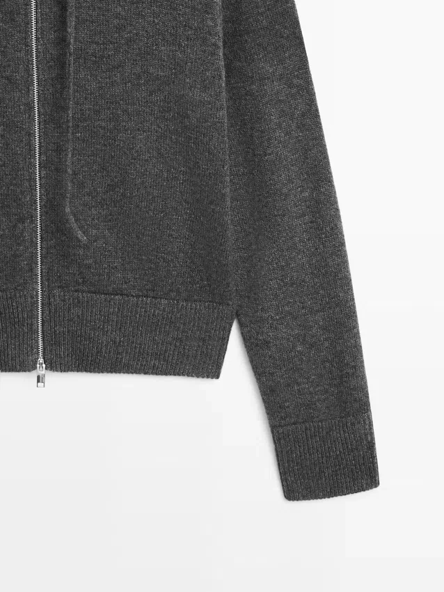 Wool Blend Knitted Cardigan. Long Sleeves. Zip Fastening. Neck with a Hood and Adjustable Elastic Drawstrings.