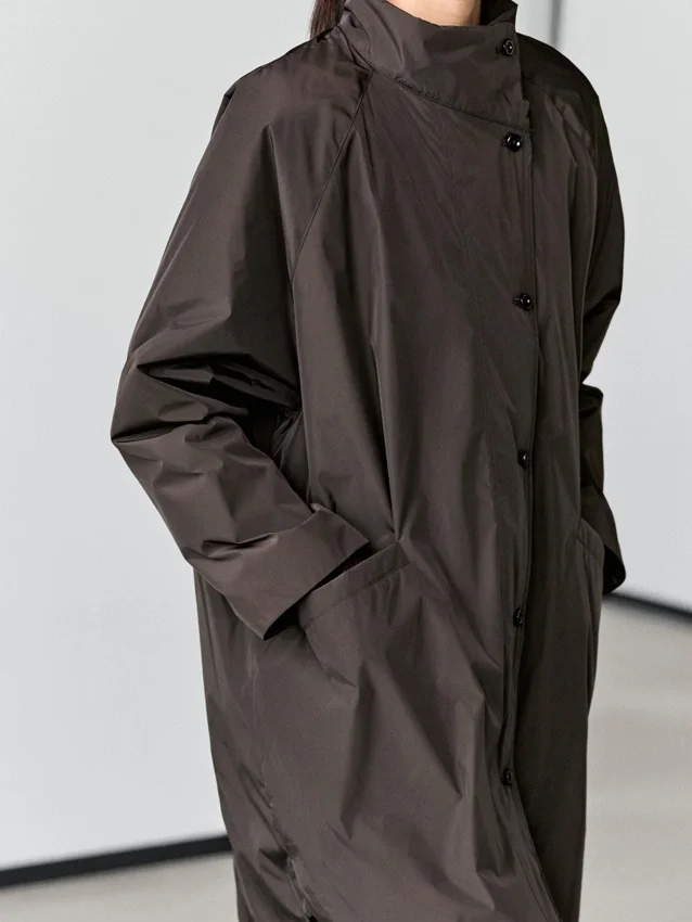 Long Puffer Jacket . Buttoned High Collar. Long Sleeves. Button-Up Front. Two Side Pockets.