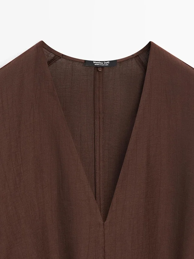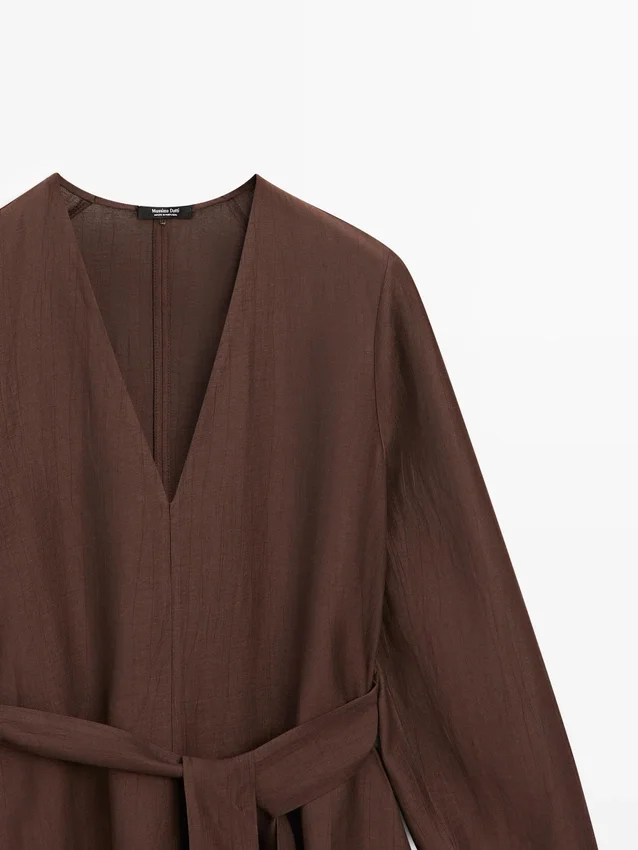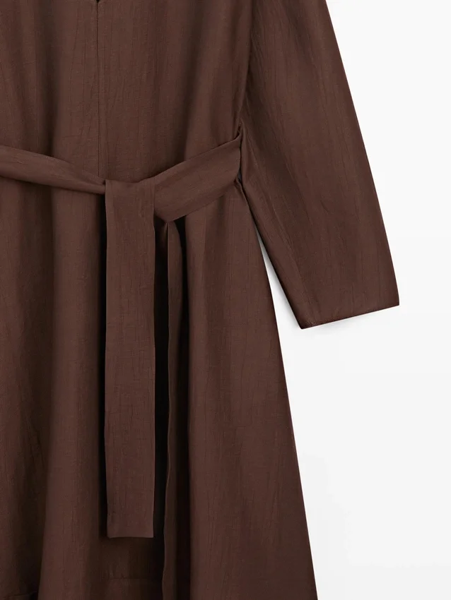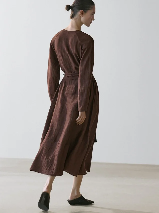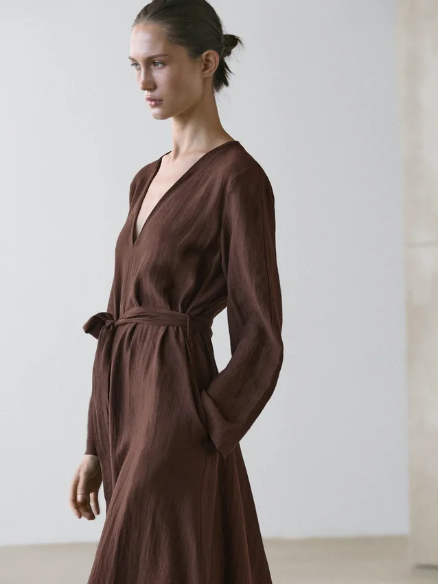 Midi Dress Made of a Linen Blend. V-Neck. Long Sleeves. Includes Belt.