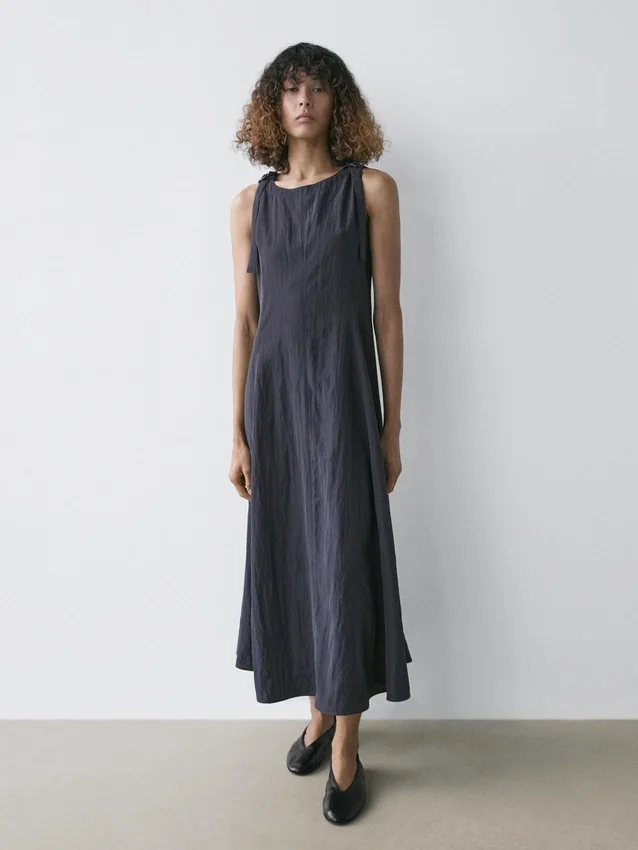 Midi-Cut Dress. Crew Neck. Sleeveless. Zip Fastening at the Back. Adjustable Shoulder Straps . Seam Details .