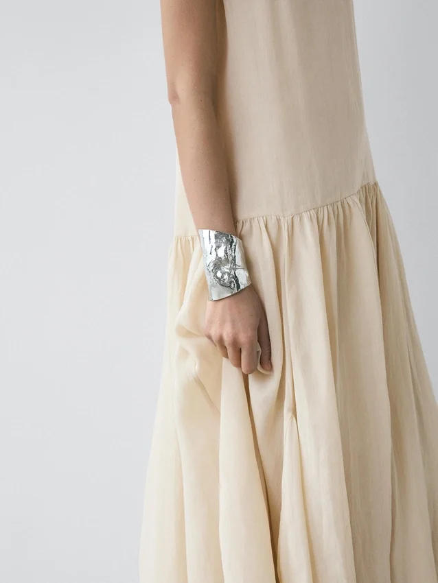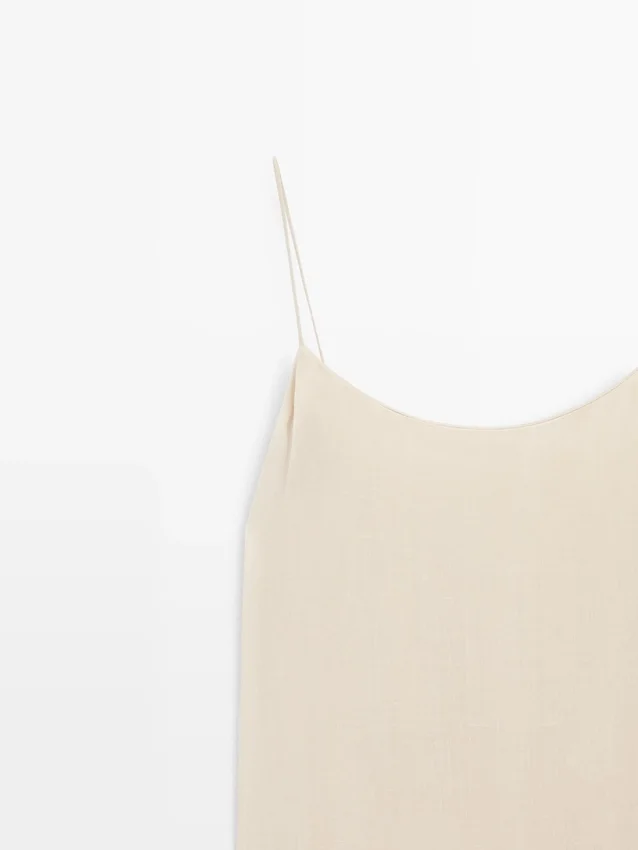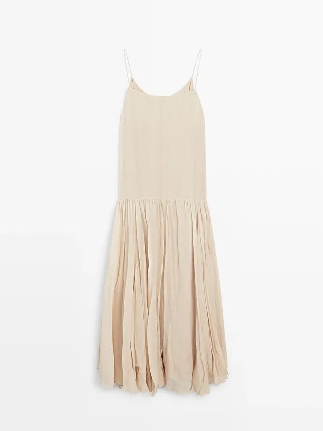 Dress Made of Flowing Fabric. Round Front and Back Neckline. Strappy. Pleated Detail.