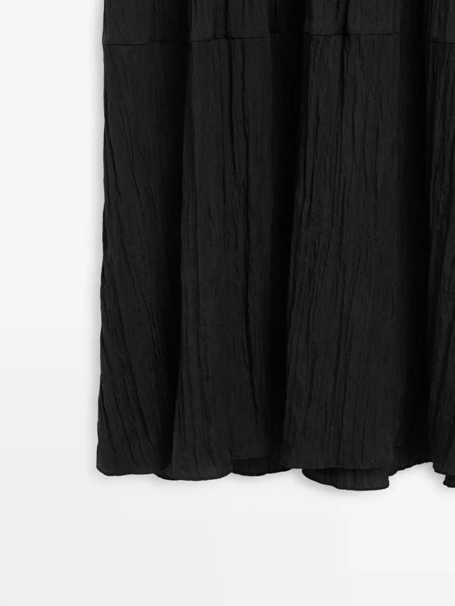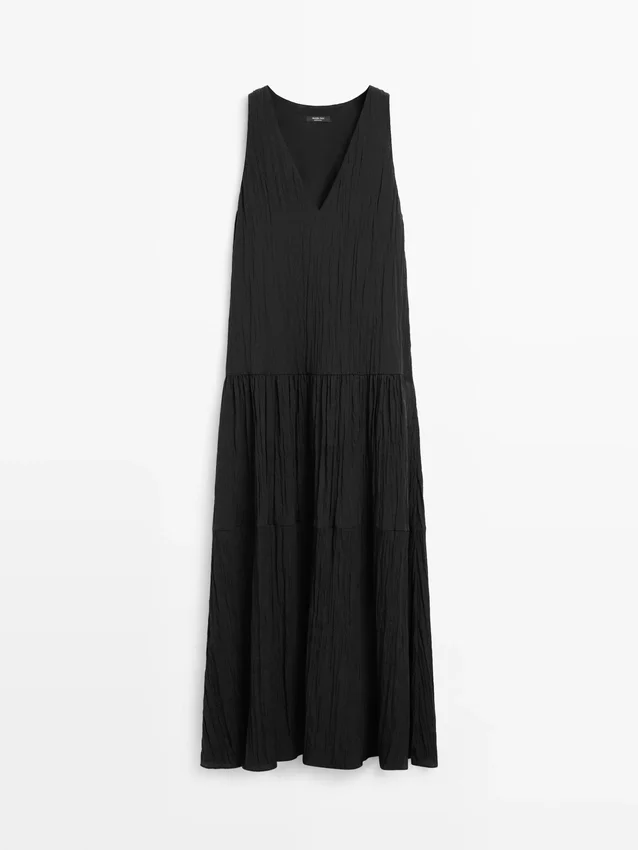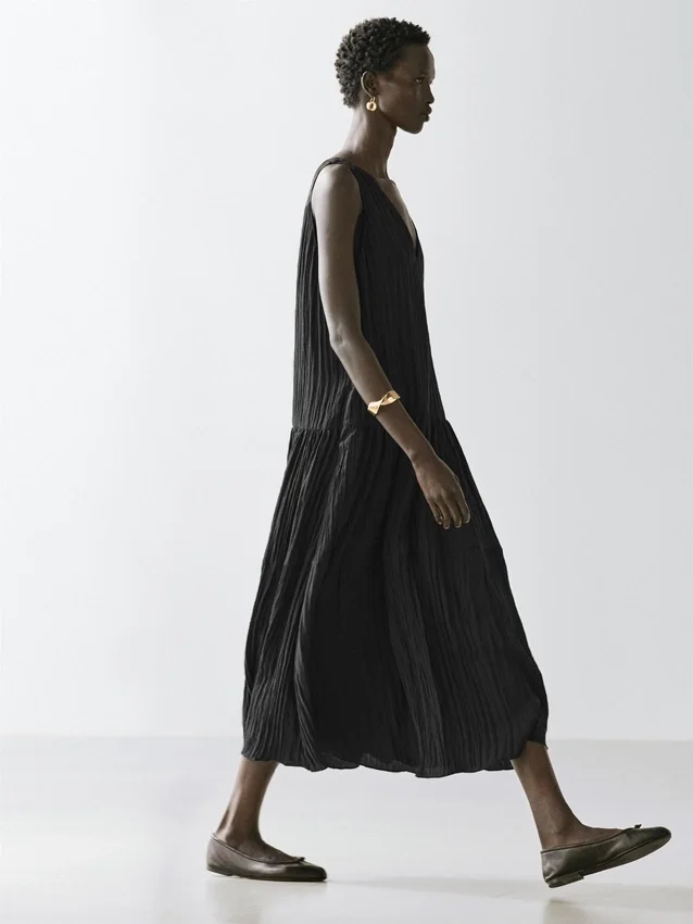 Midi Dress with Pleated Finish. Thick Straps. V-Neck. Cotton Lining. Flowing and Lightweight Fabric .