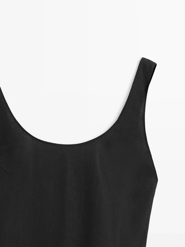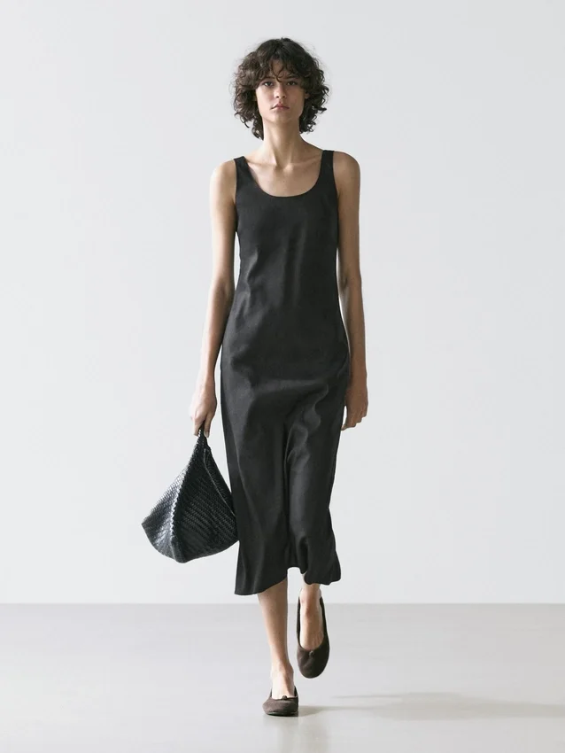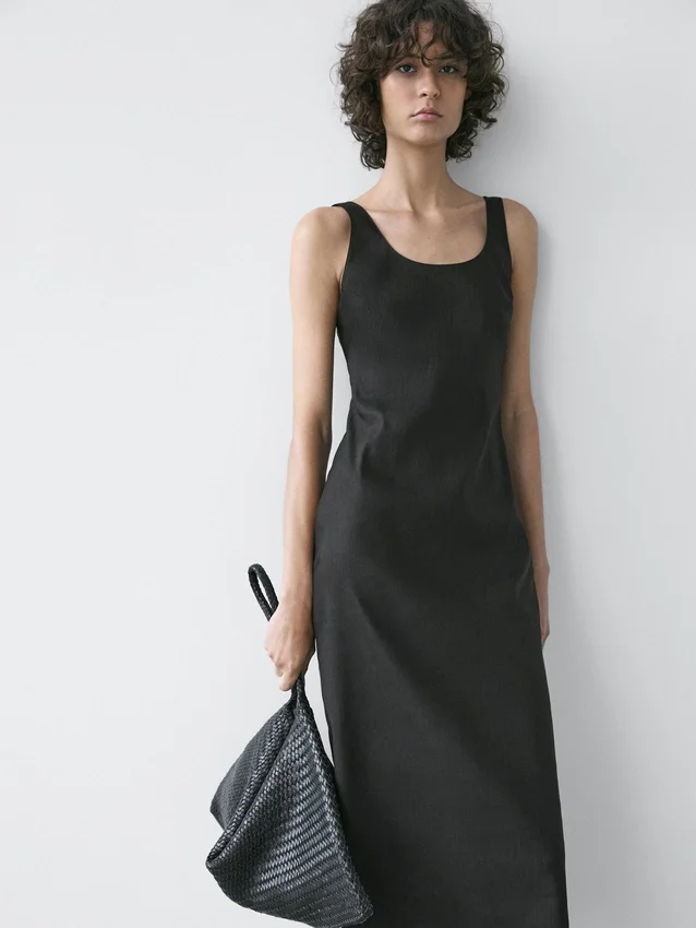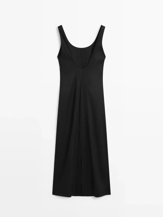 Midi Dress Made of a Linen Blend. Neckline Detail at the Back . Round Neck. Thick Straps. Flowing and Lightweight Fabric .