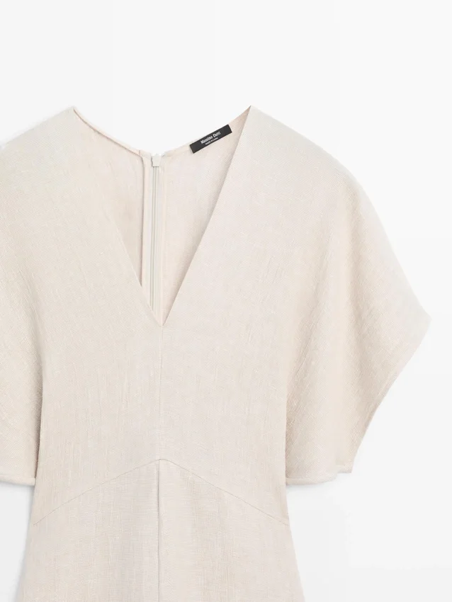 Midi Dress Made of 100% Linen Fabric . V-Neck . Short Sleeves. Zip Fastening at the Back. Flowing and Lightweight Fabric .
