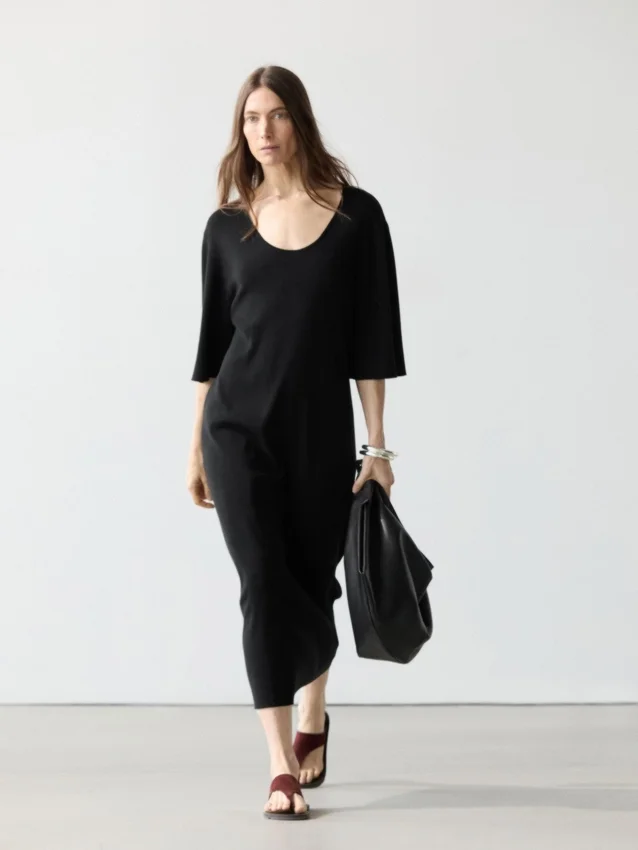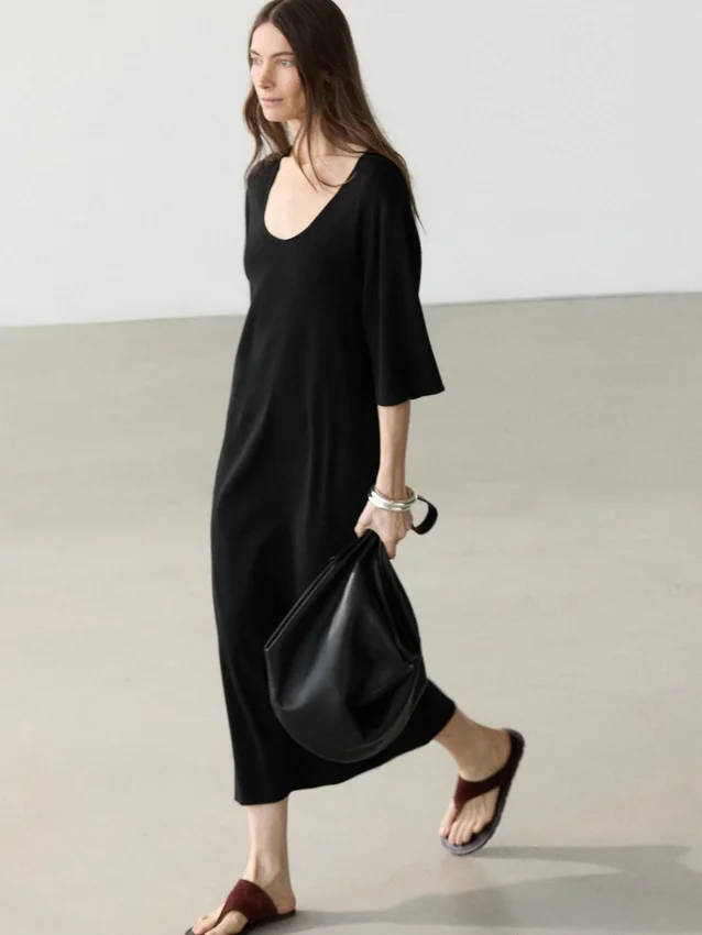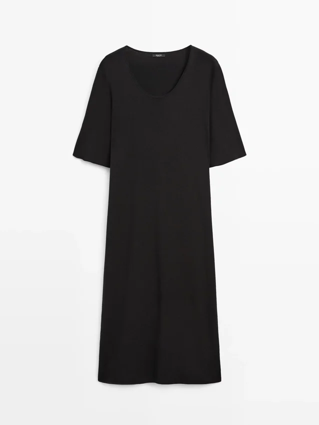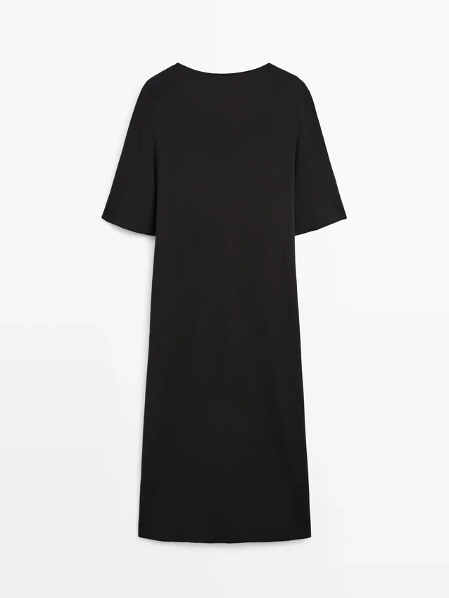 Midi Dress Made of Fabric with Cotton. Round Neck. Three-Quarter Length Sleeves.