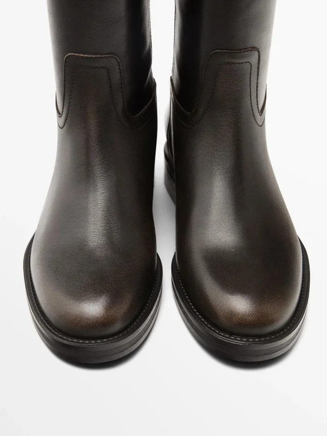 Made of Cowhide Leather. Brushed Distressed Leather. Detachable Ankle Strap. Gold Appliquas. Leather Lining and Insole . Leg Height: 42 Cm. Leg Width: 37 Cm. Heel: 3Cm. Includes Airfit® Insole: Flexible Technical Foam Insole, Designed to Offer Greater Comfort.