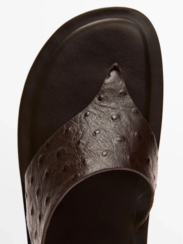 Flat Slider Sandals Made of Sheepskin Leather. Elastic Strap at the Back. Leather Lining and Insole . Embossed Animal-Print-Effect Leather. Toe Separator. Leather Sandals.