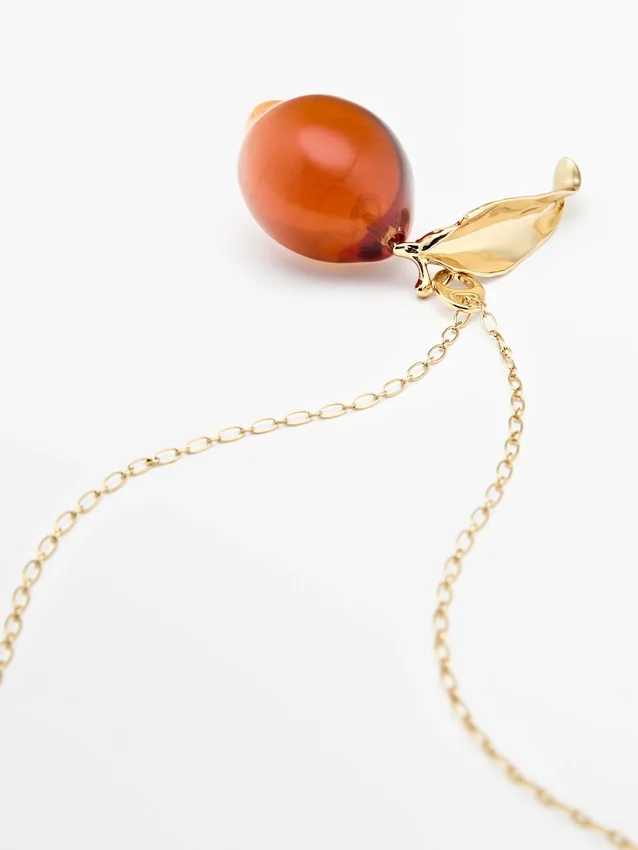 Chain Necklace with Glass Pendant Drop and Leaf Detail. Lobster Clasp Fastening.