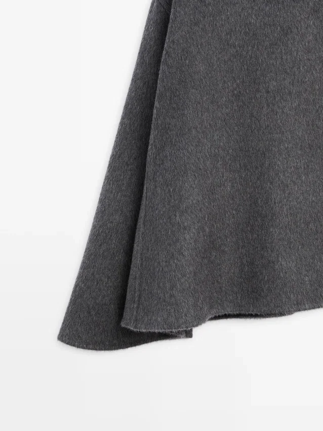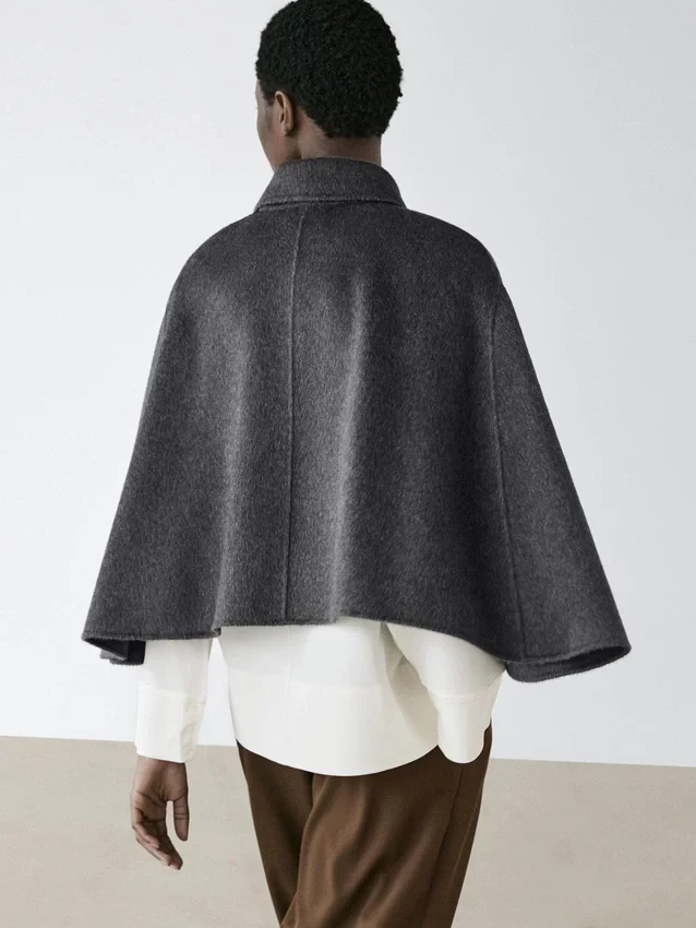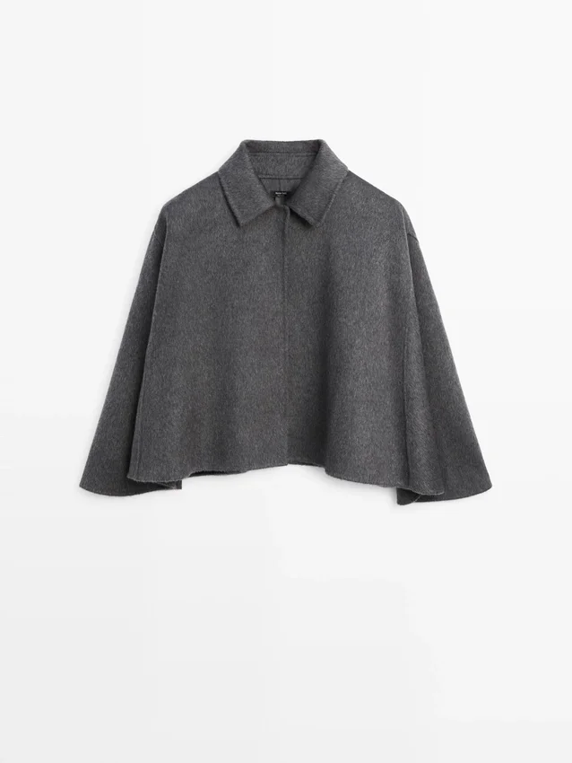 Wool Blend Cape. Shirt Collar. Button and Hidden Buttoned Strap Fastening .