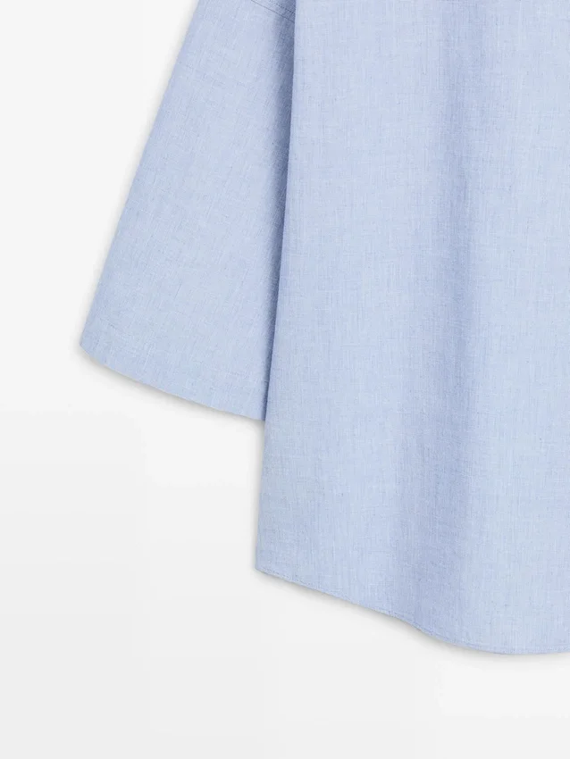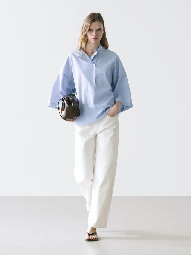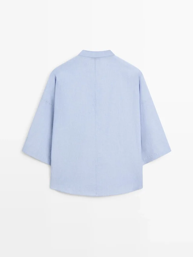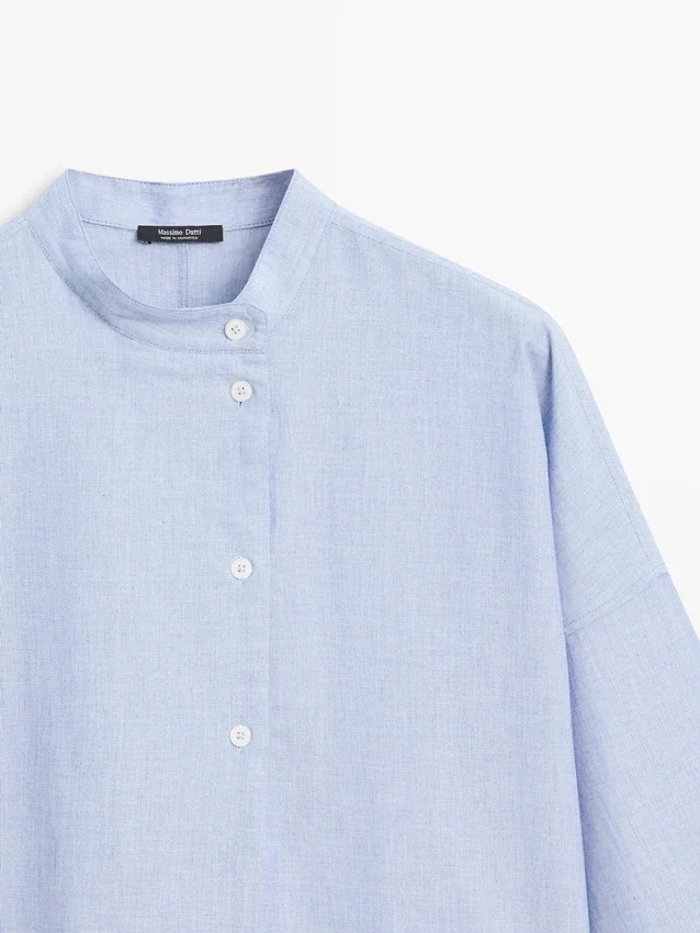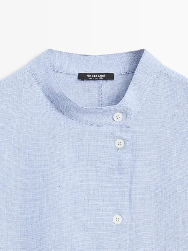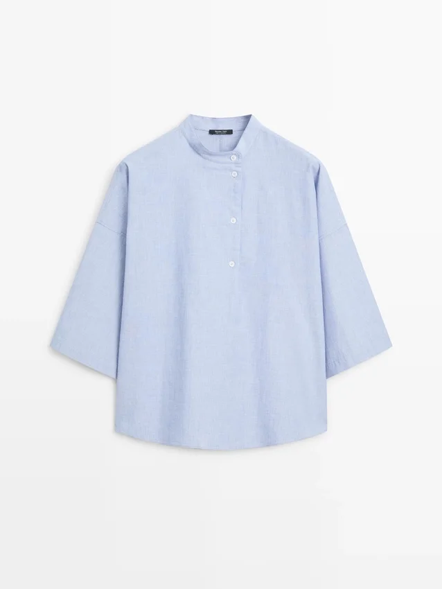 Blouse Made of 100% Cotton Fabric. Buttoned High Collar. Elbow-Length Sleeves. Button-Up Front. Flowing and Lightweight Fabric .