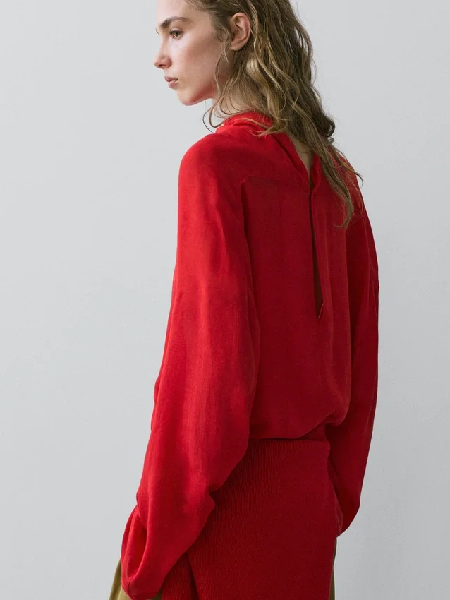Flowing Blouse. Draped Collar. Long Sleeves. Back Button Fastening and Teardrop Opening.