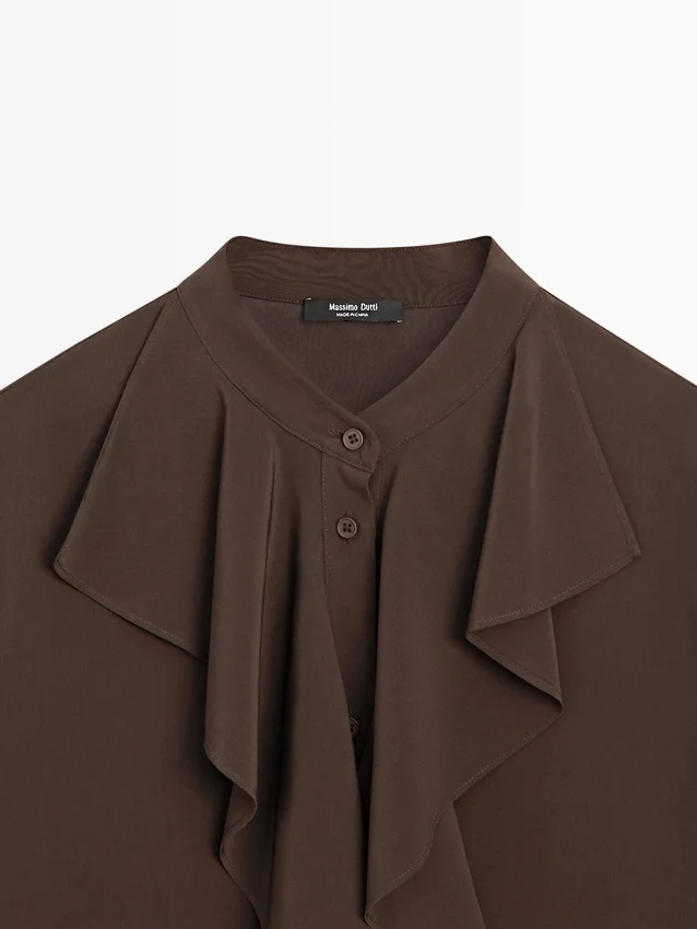 Flowing Blouse with Long Sleeves. Stand-Up Collar. Button-Up Front. Ruffled Detail.