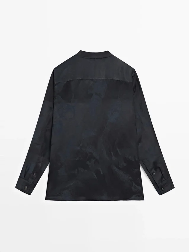 Flowing Shirt Made of a Linen Blend Fabric. Long Sleeves with Buttoned Cuffs. Stand-Up Collar. Jacquard Print. Button-Up Front.