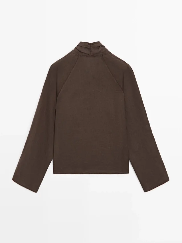 Blouse Made of 100% Linen Fabric. V-Neck . Long Sleeves. Cross-Over Fastening with Hidden Buttons. Draped Neckline Detail. Flowing and Lightweight Fabric . Wide and Relaxed Silhouette, Not Tailored.
