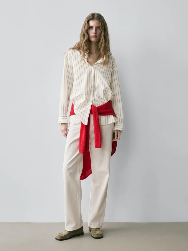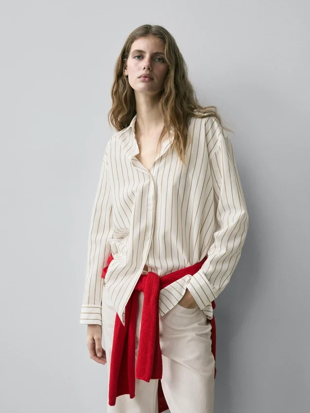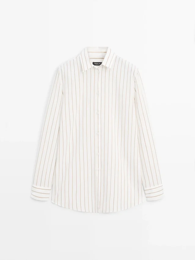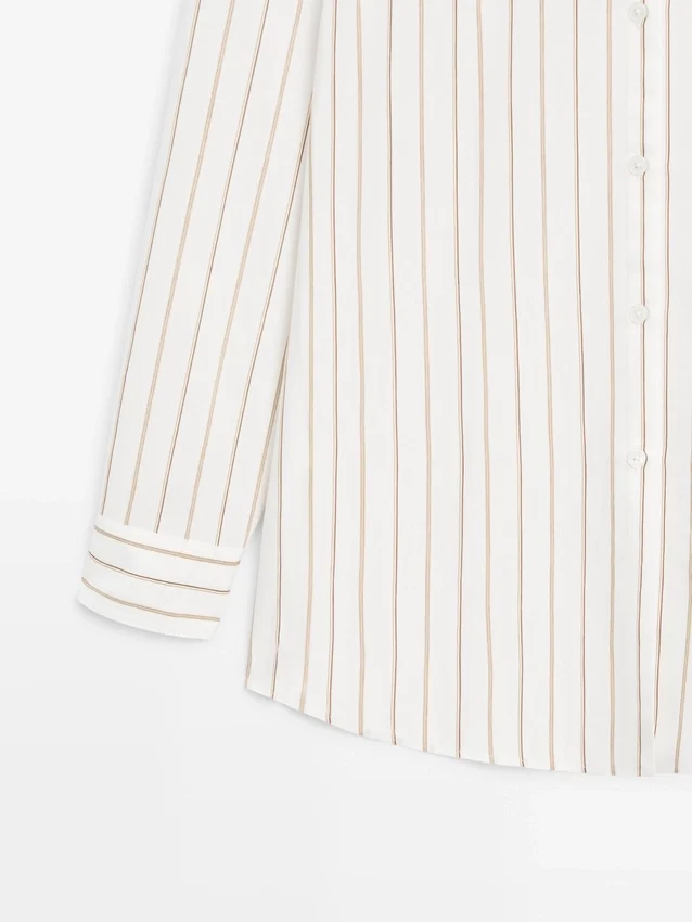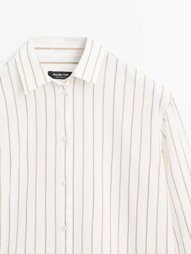 Shirt Made of Viscose Blend Fabric. Long Sleeves with Buttoned Cuffs. Shirt Collar. Button-Up Front. Striped Detail.