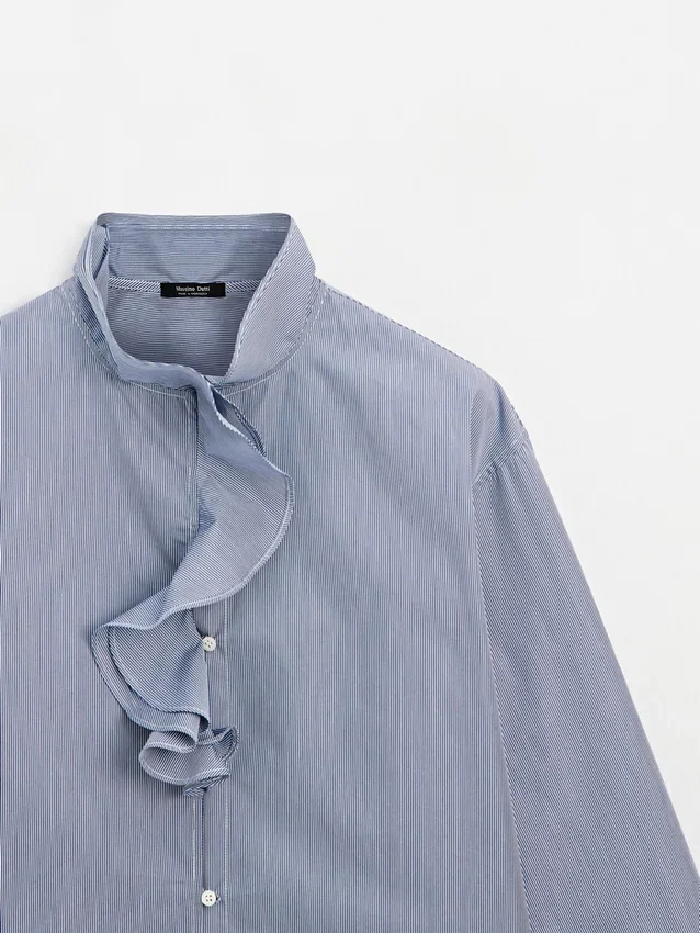 Shirt Made of 100% Cotton Fabric. Long Sleeves. Ruffled Detail on the Neck . Button-Up Front. Striped Detail.