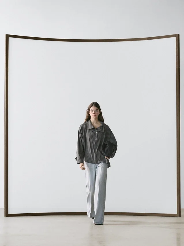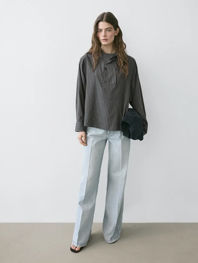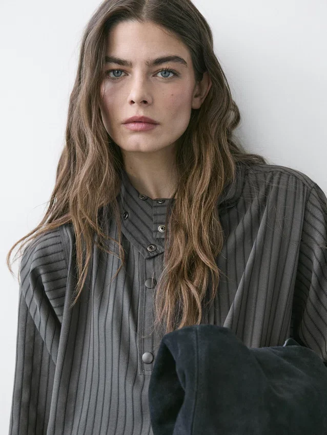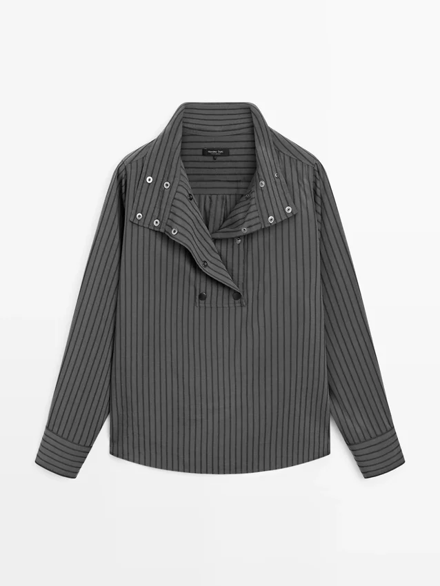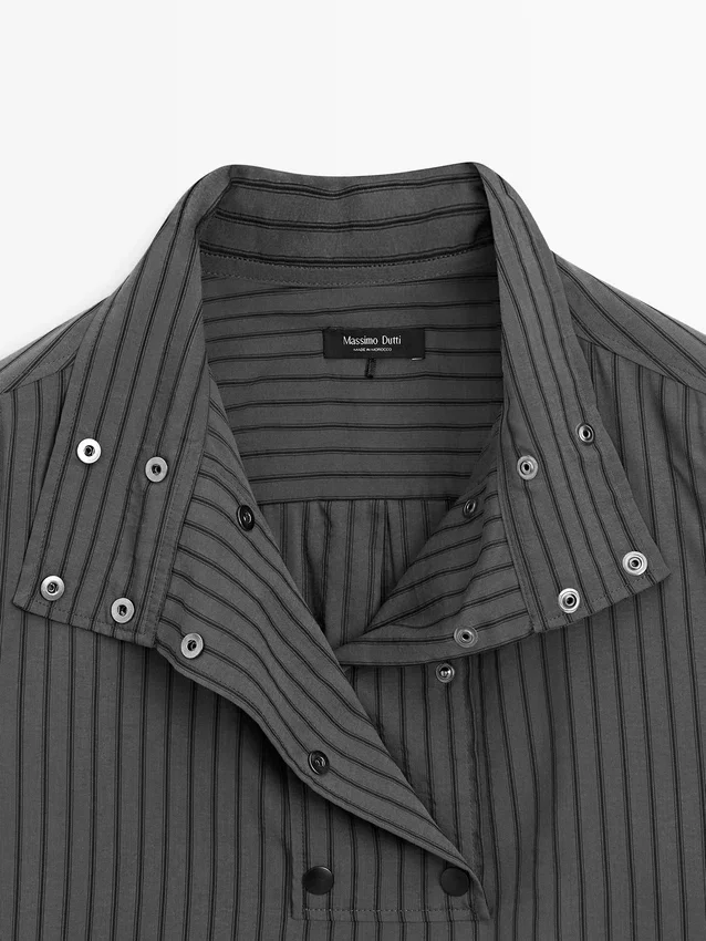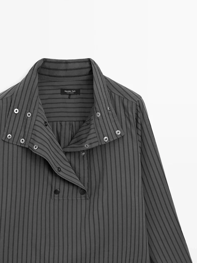 Flowing Shirt. Long Sleeves with Buttoned Cuffs. Buttoned High Collar. Striped Print.