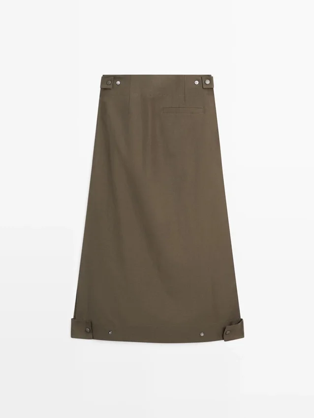 Cotton Blend Midi Skirt. Sash Detail at the Waist. Zip Fastening Concealed by a Placket, with Hook-And-Eye Clasp and Button.
