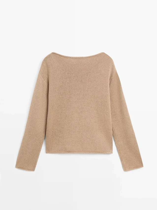 Sweater Made of Cotton and Linen Fabric. Boat Neck. Long Sleeves. Patch Pocket at the Chest.