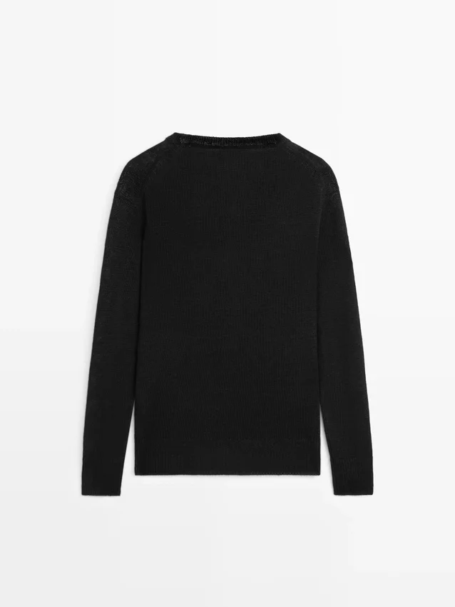 Knitted Sweater Made of Linen. V-Neck. Long Sleeves. Ribbed Trims .