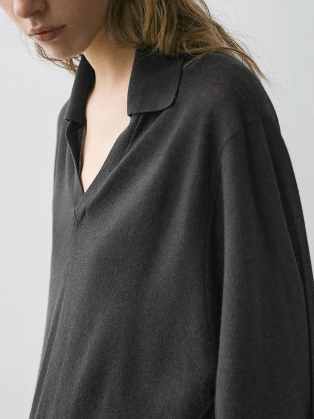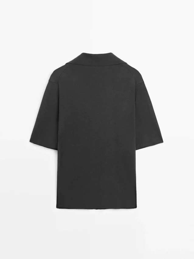 Sweater Made of a Silk and Wool Knit Blend. Johnny Collar. Short Sleeves. Fine Knit Fabric. Rib Detail on the Collar. Curl Effect Finish. Oversize.