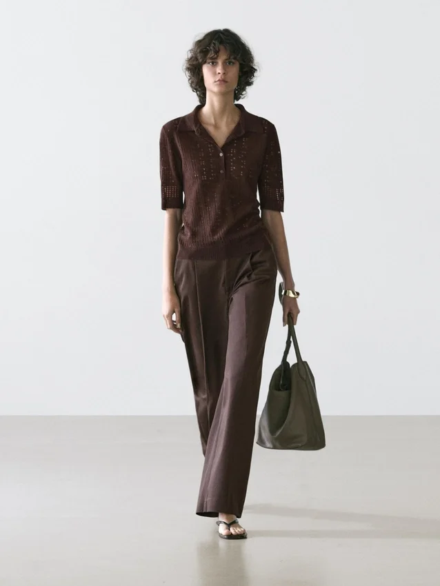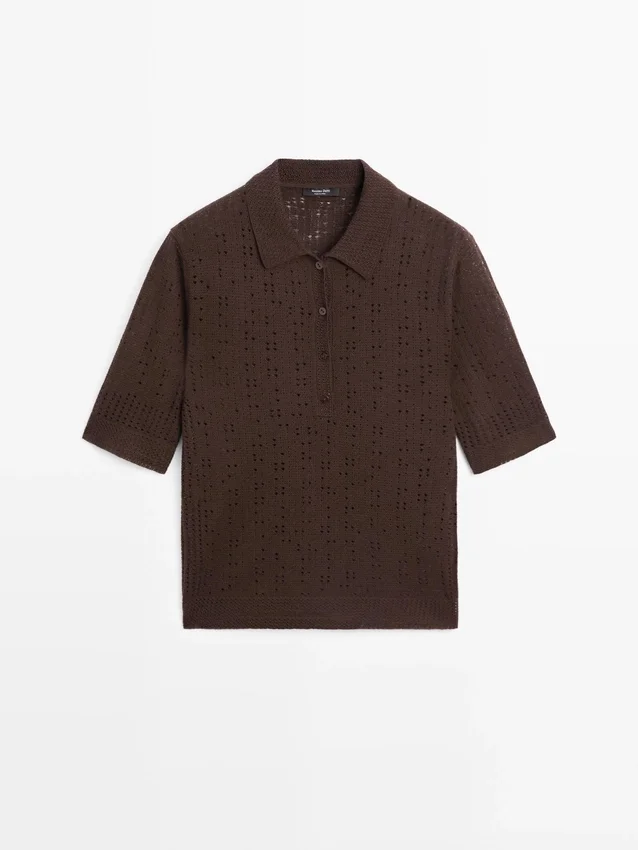 Polo Shirt Made of a Knit Wool Blend. Short Sleeves. Polo Collar with Button Fastening. Ribbed Trims . Openwork Detail.