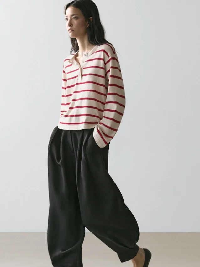 Sweater Made of Cotton Fabric. Long Sleeves. Round Buttoned Neck. Striped Detail.