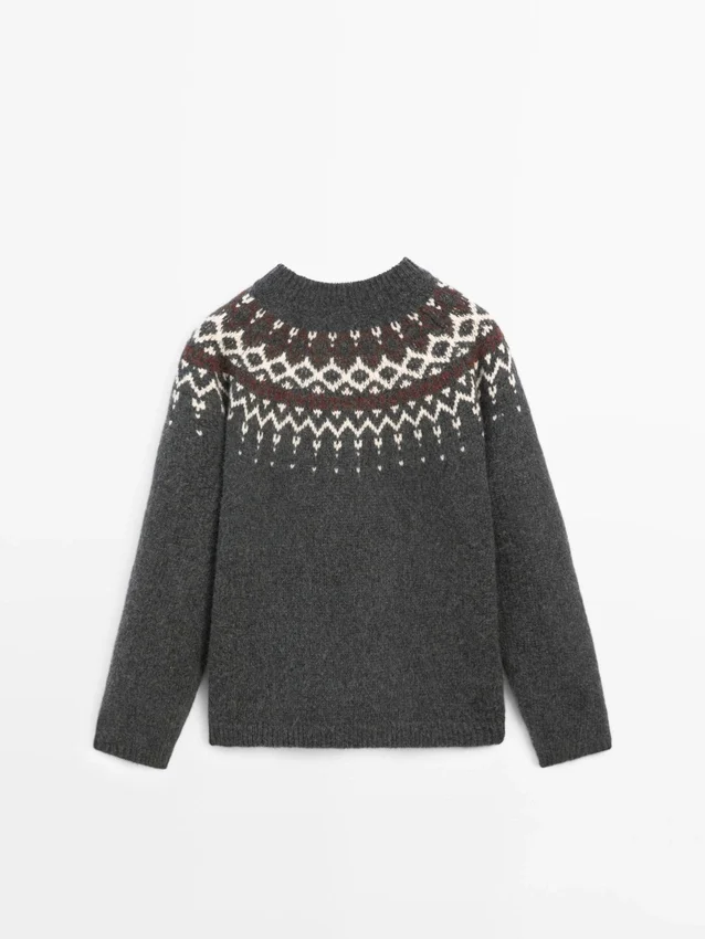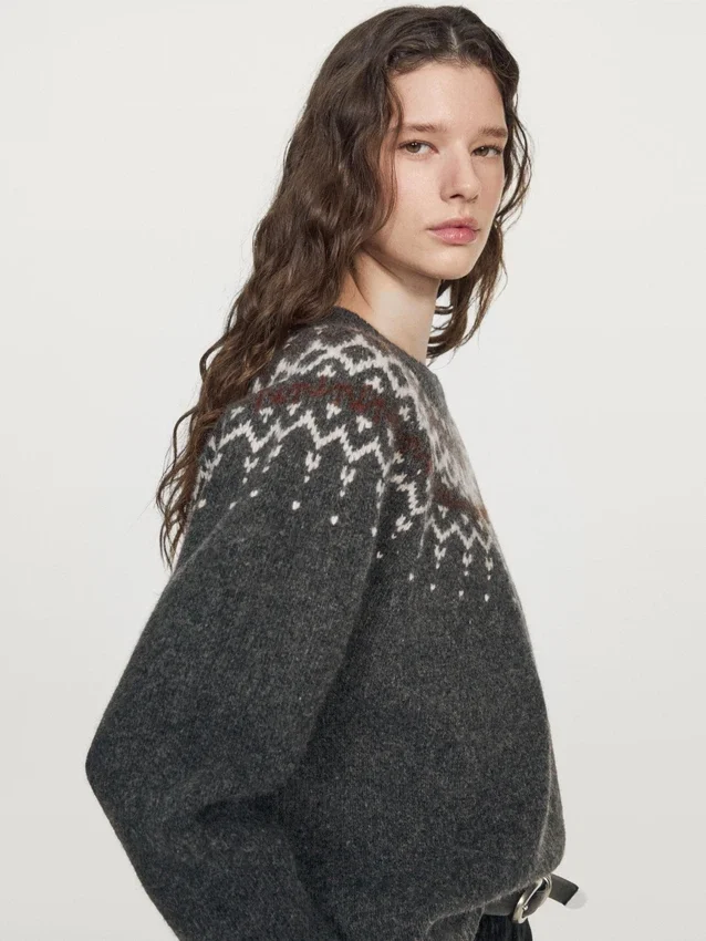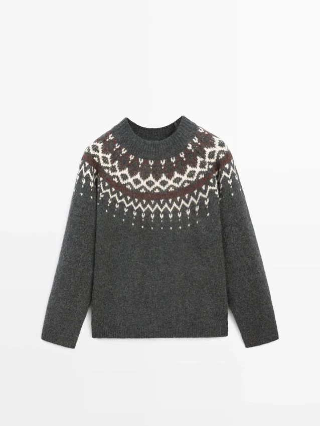 Sweater Made of Wool. Crew Neck. Long Sleeves. Jacquard Fabric. Ribbed Trims . Wide and Relaxed Silhouette, Not Tailored.